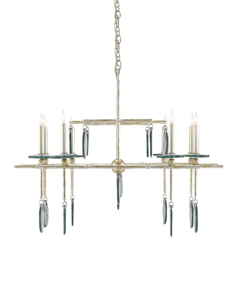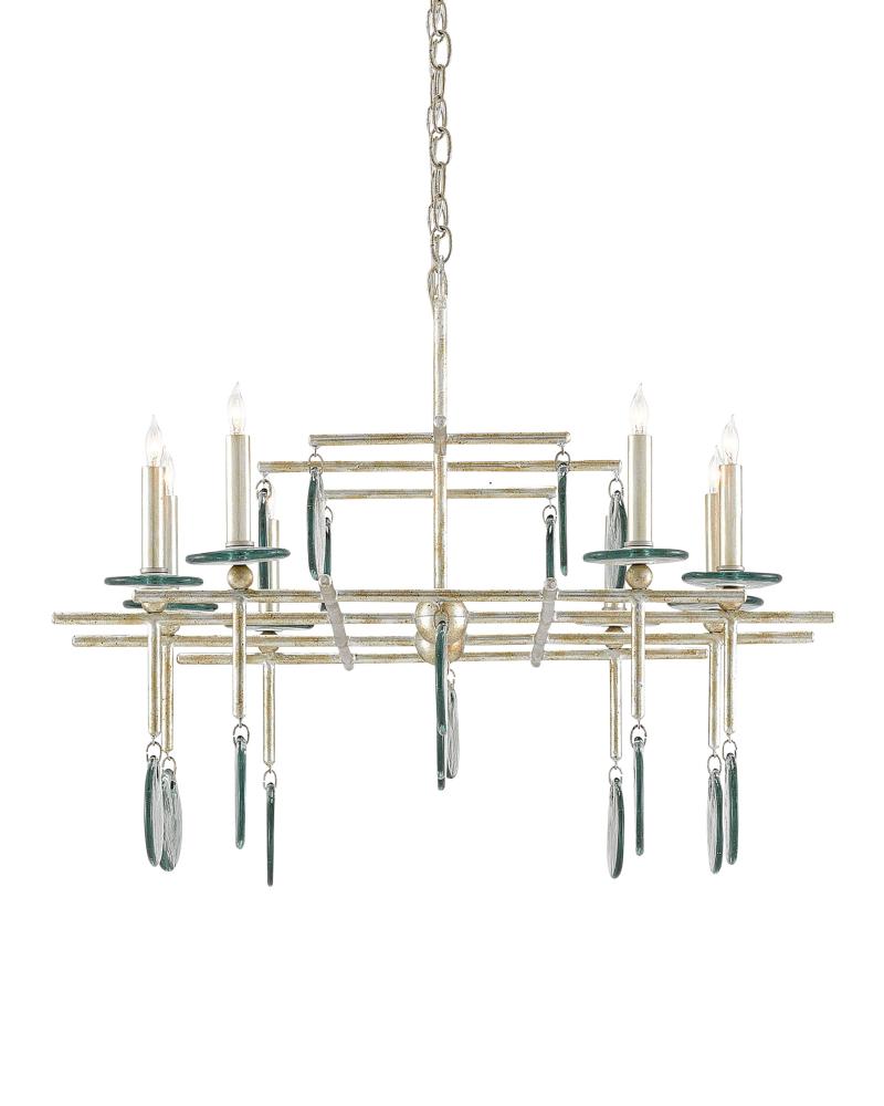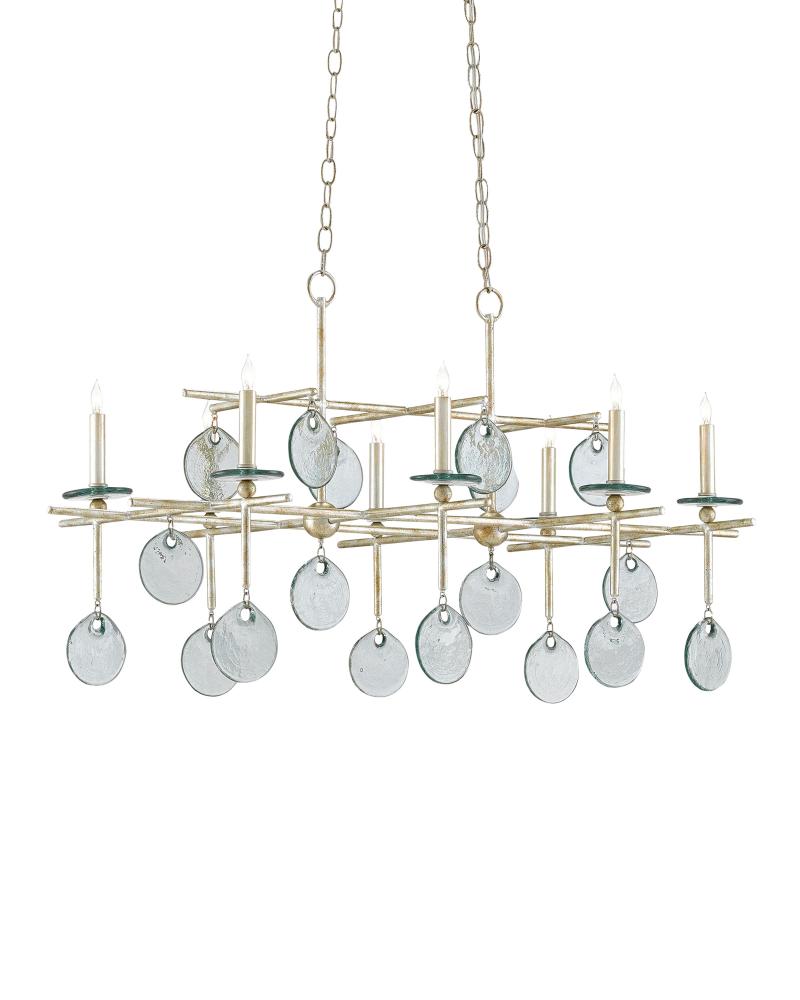 Though geometrically astute in its appearance, this silver version of the Sethos Rectangular Chandelier takes its ornamentation seriously. The linear wrought iron frame has been treated to a silver Granello finish to give the design a bit of sheen. The discs of recycled glass dangling from the arms of the eight-light fixture also glint when light pierces them. The unusual appearance of this chandelier will appeal to those who have grown weary of the ubiquitous candelabra. We also offer this fixture in an old iron finish.