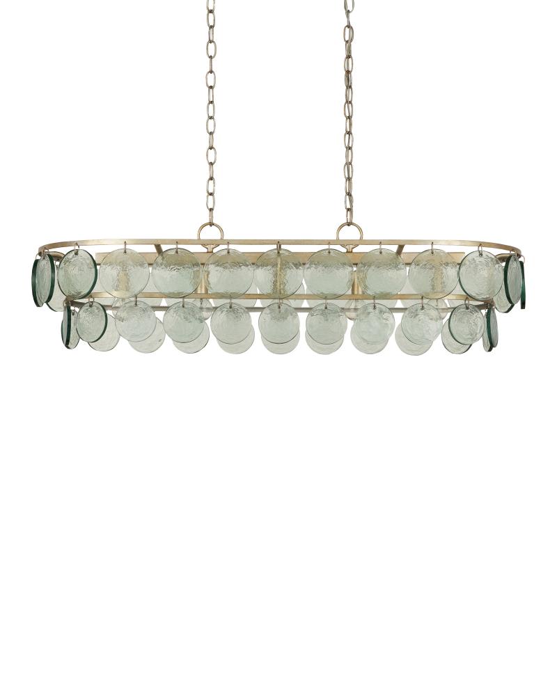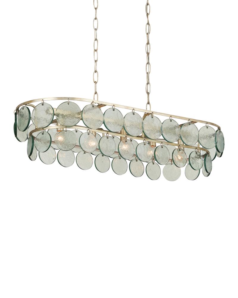 The Settat Chandelier has recycled glass discs dangling from stacked oval ribs in a silver leaf finish. This design is light and airy thanks to the gleaming finish, the minimal chains from which it hangs, and the reflectivily of the glass. The silver chandelier will also introduce a subtle texture to a space given the whorls inherent in the recycled material, which gleams beautifully when the lights are switched on. Adjustable from 16.75" to 84.25" with use of included chain/rod kit/cable. If your space calls for a longer drop, additional chain/rods/cable is available for purchase.