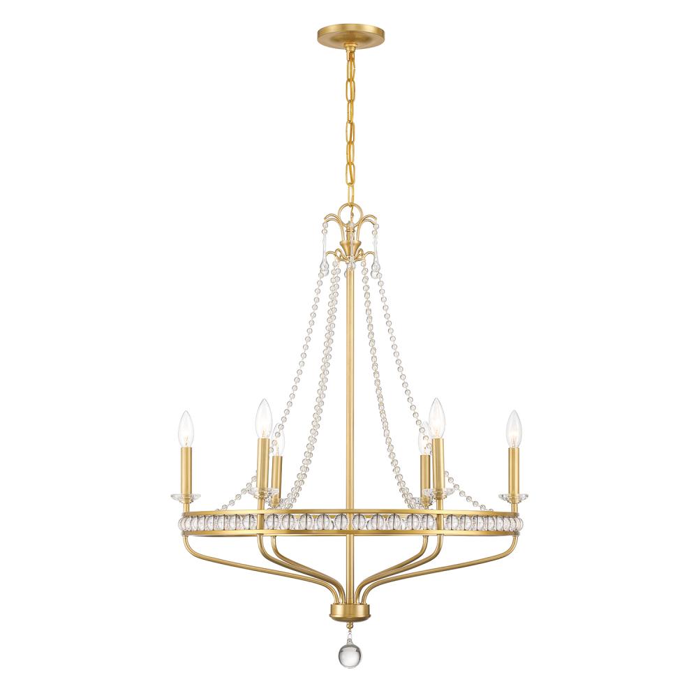 The Seville collection presents a modern take on a classic early American design. Glass balls gracefully cascade downwards, connecting to a circular gold metal framework that encases additional glass within the structure. This innovative design revamps the traditional candle-style appearance with a contemporary touch, resulting in a striking focal point that effortlessly combines classic charm with modern sophistication.