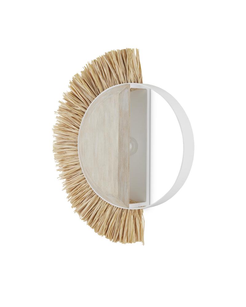 Take a trip to the beach with Jamie Beckwith. Her Seychelles Wall Sconce, which joins her collection of lighting, was inspired by an island-hopping vibe. The circular profile of the white sconce is made of wrought iron in a sugar white finish that is fitted with a wood panel in a sandstone finish. From this extends hand-cut sprays of raffia. The openings into which the natural material is inserted emits a warm glow when light wafts through them. This sconce is flexible, as it can be mounted with the raffia pointing in any direction.