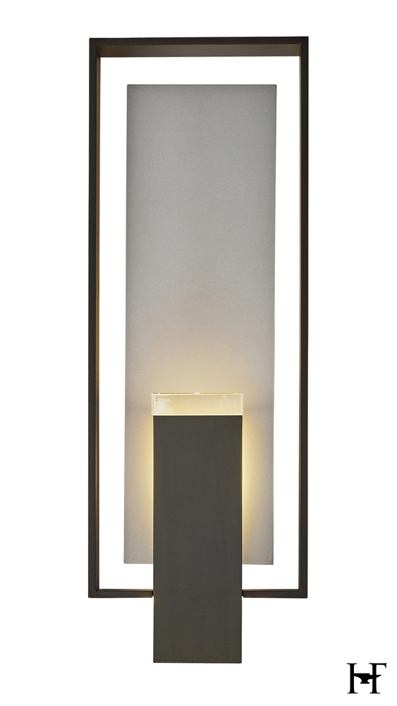 Layers of diffused light and dramatic shadow create the perfect blend of style and austere lines. By focusing on materials and faultless geometric balance, this large Shadow Box sconce makes a statement. This Dark Sky Friendly version allows us to truly appreciate the night sky's constellations by impeding uplight and directing the light downward. Offered as a two-toned wall sconce, with the frame being one finish and the backplate another, if desired. Available in a choice of AAMA 2604-rated Coastal Outdoor Finishes. Custom backplate option.