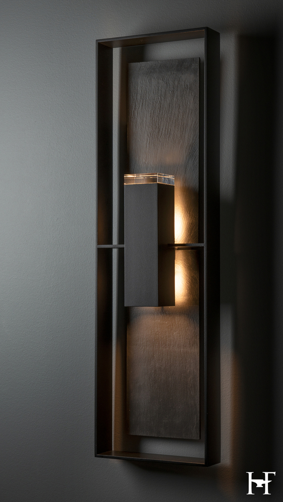 This 34" tall Shadow Box features a natural Vermont black slate backplate, giving it an organic sense of drama. Designer David Martin was inspired by contemporary architecture as he conceived this stunning outdoor wall mount. In an effort to protect our night skies from unnecessary light pollution, this Dark Sky Friendly version features a light inhibitor, impeding uplight from interfering with the evening splendor. Available in a choice of AAMA 2604-rated Coastal Outdoor Finishes.