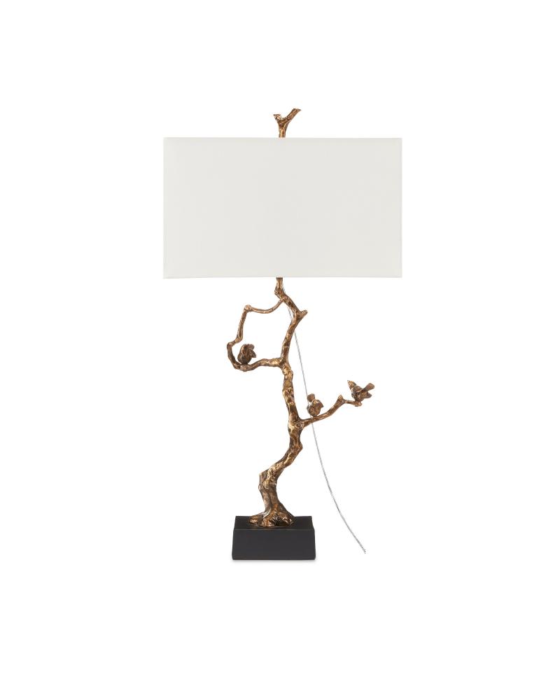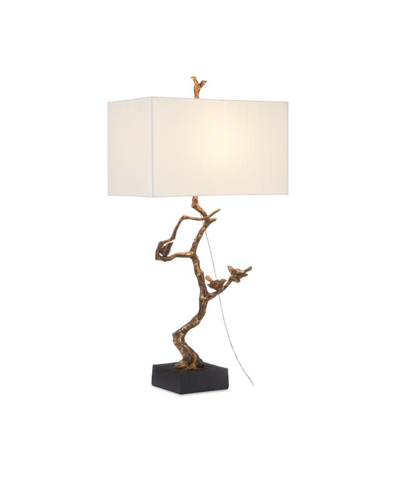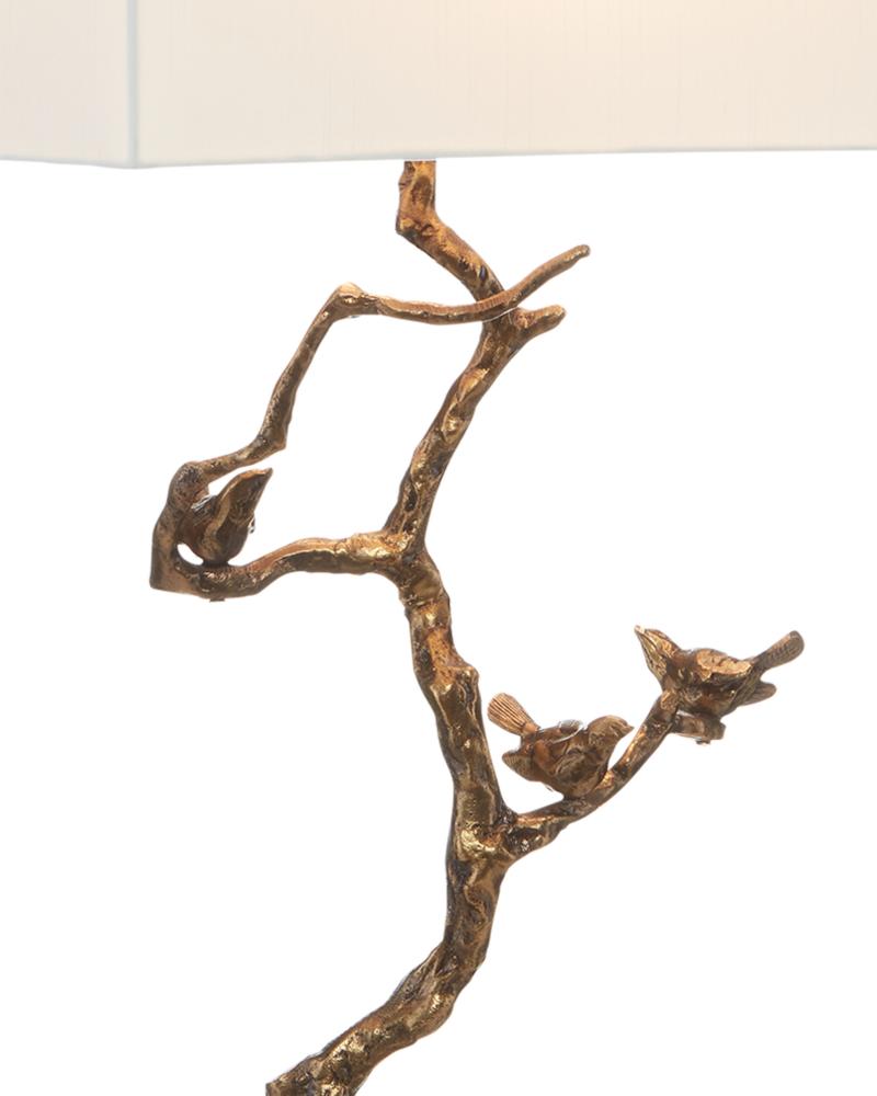 The Shadows Table Lamp features a design that seamlessly disappears beneath and eclipses the white rectangular shade, which is topped with a matching finial. Inspired by twigs found in nature, the lamp is cast from aluminum in an antique brass finish and sits atop a black marble-style base.