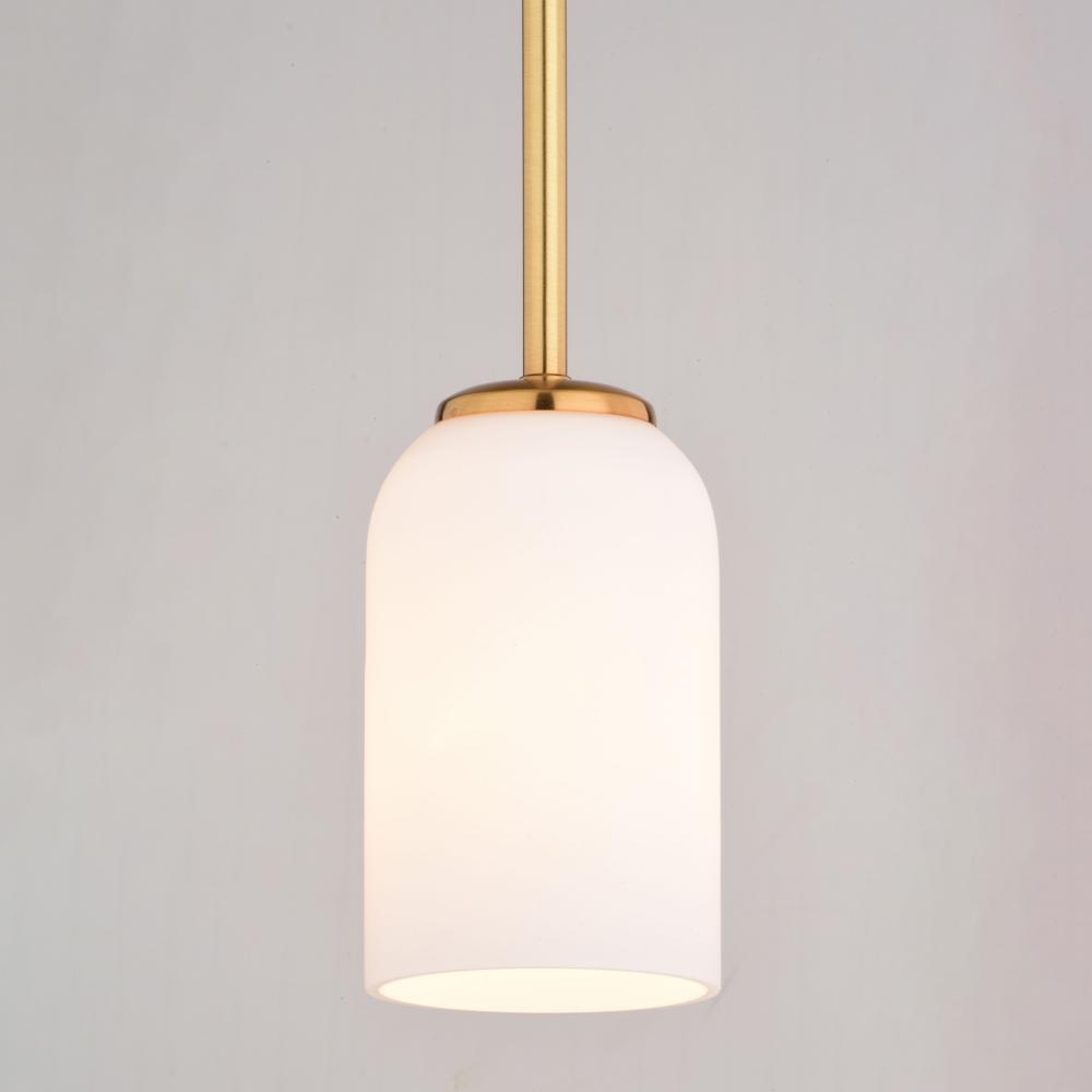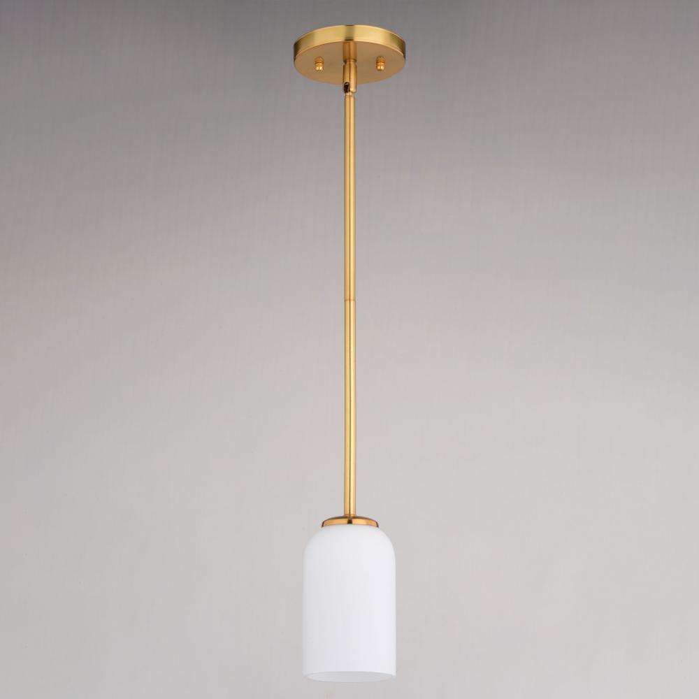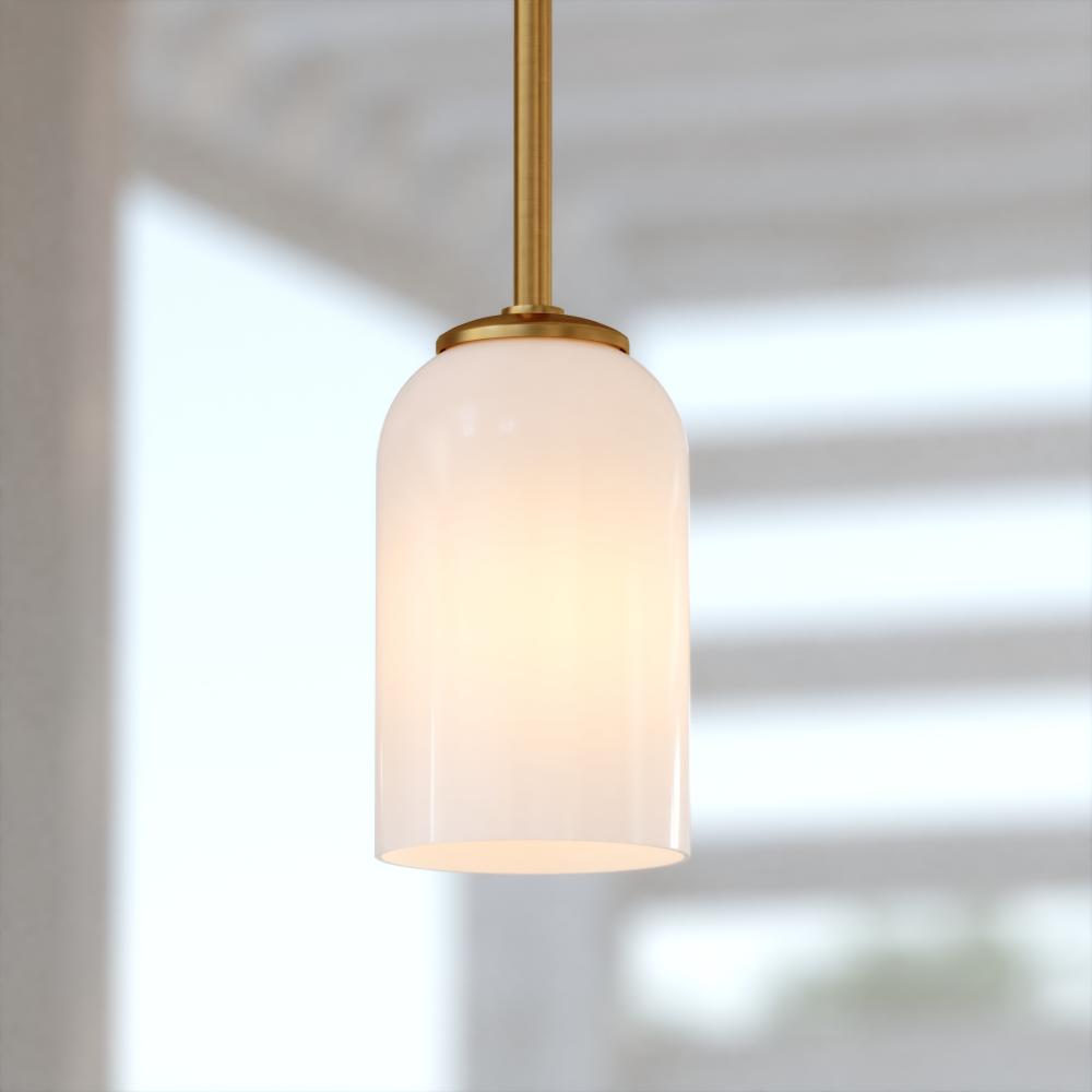 Illuminate your kitchen island or eat-in space with the Shelby 1 Light Mini Pendant. Its classic design and natural brass finish add a touch of timeless sophistication for both transitional and contemporary spaces. The elongated white dome-shaped glass shade emits a soft, diffused light, creating a warm and inviting atmosphere that's perfect for hanging out or doing homework.