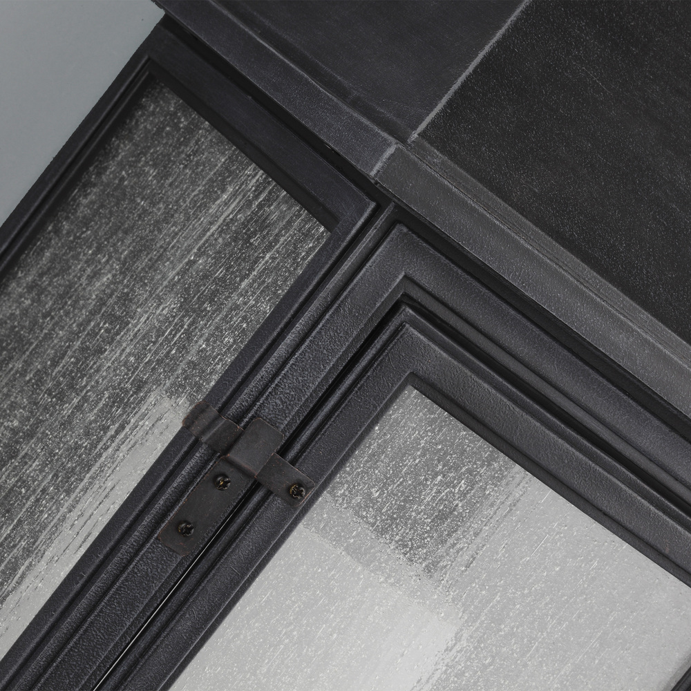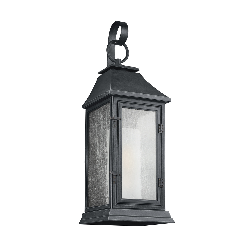 Inspired by traditional Parisian style lanterns, the Shepherd outdoor lighting collection by features a decorative shepherd's crook, a latched and hinged front door panel, an inner Case White glass shade, Clear Seeded outer glass to create the visual appearance of vintage gas lanterns. Made of a proprietary composition for outstanding durability even in the harshest elements, the collection has a 5-year warranty. Offered in either Dark Weathered Zinc or Heritage Copper finishes.