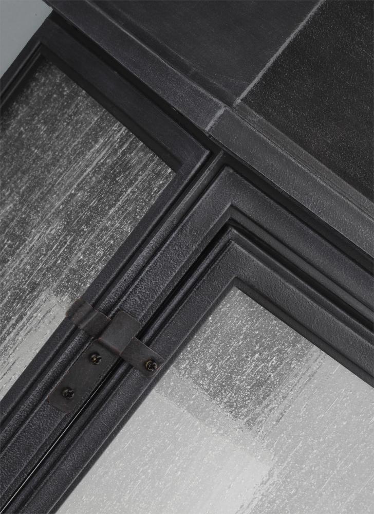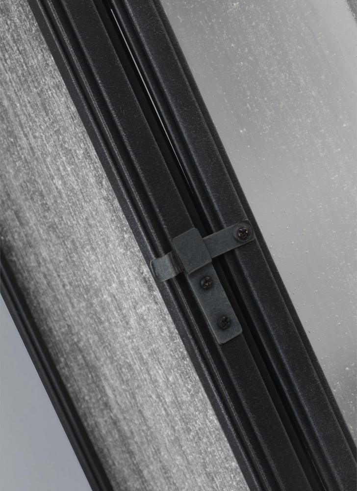 Inspired by traditional Parisian style lanterns, the Shepherd outdoor lighting collection by features a decorative shepherd's crook, a latched and hinged front door panel, an inner Case White glass shade, Clear Seeded outer glass to create the visual appearance of vintage gas lanterns. Made of a proprietary composition for outstanding durability even in the harshest elements, the collection has a 5-year warranty. Offered in either Dark Weathered Zinc or Heritage Copper finishes.