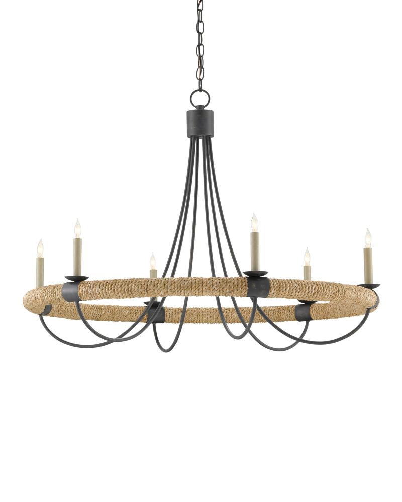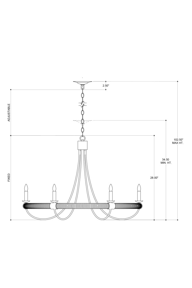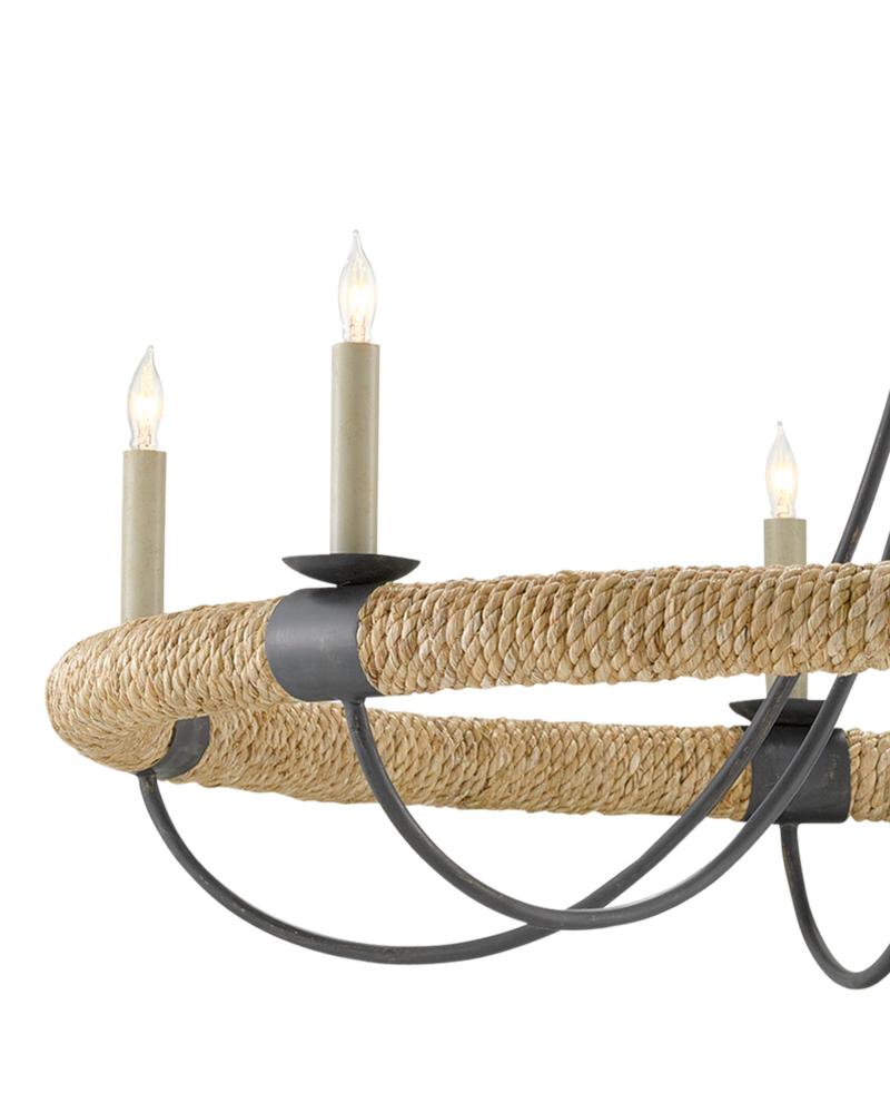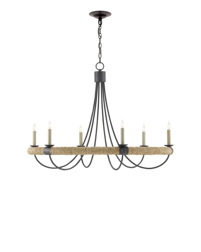 The design of the Shipwright Chandelier brings a nautical theme to life with its large scale and thoughtful details. This is achieved with the abaca rope that wraps the ring holding the bobeches and candle arms. Made of wrought iron in a mix of French black and smokewood finishes, the rope chandelier is decidedly sea-side worthy while also checking the box on modern farmhouse style. Adjustable from 34.5" to 102.5" with use of included chain/rod kit/cable. If your space calls for a longer drop, additional chain/rods/cable is available for purchase.