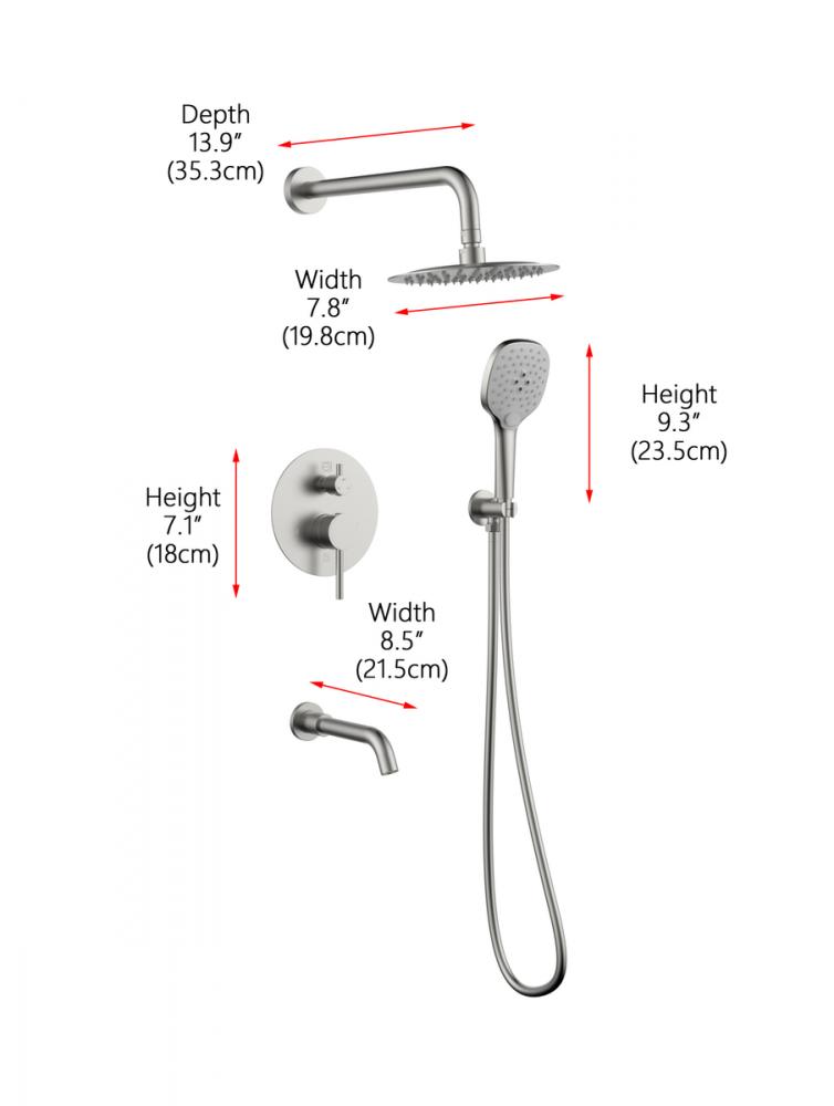 Package includes rough-in valve, 8-inch shower head, 14 inch shower arm, Escutcheon flange, 59 inch hose, wall supply elbow, 7 inch faucet trim with handles, 9 inch hand-held showerhead, 8.5 inch tub spout with flange.