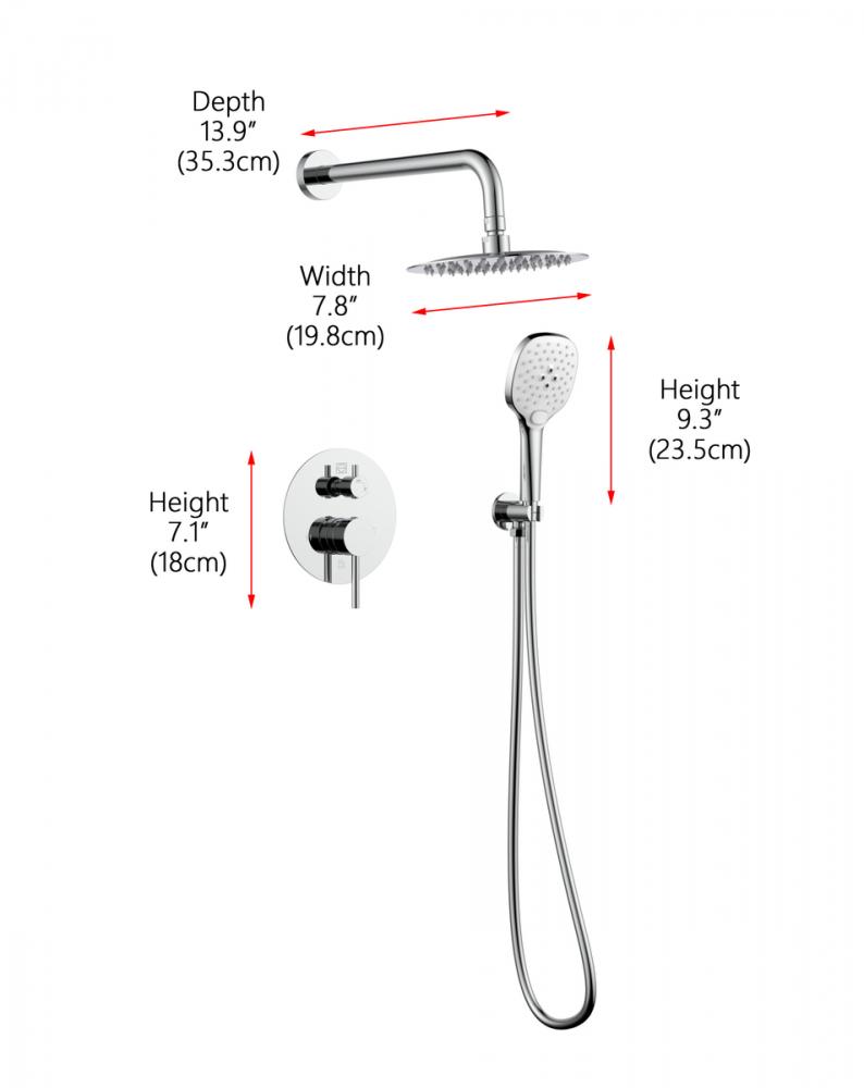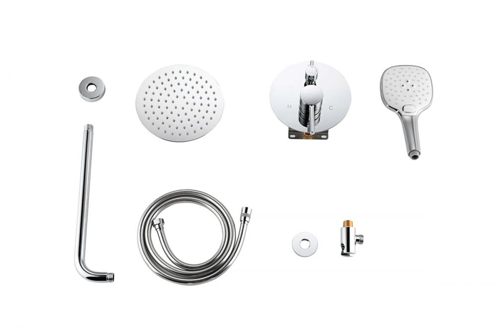 Package includes rough-in valve, 8-inch shower head, 14 inch shower arm, Escutcheon flange, 59 inch hose, wall supply elbow, 7 inch faucet trim with handles, 9 inch hand-held showerhead.