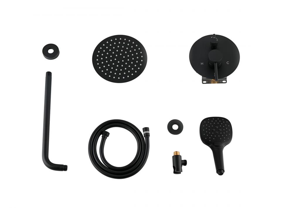 Package includes rough-in valve, 8-inch shower head, 14 inch shower arm, Escutcheon flange, 59 inch hose, wall supply elbow, 7 inch faucet trim with handles, 9 inch hand-held showerhead.