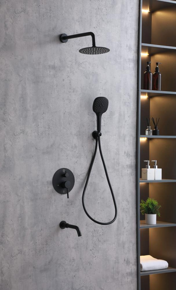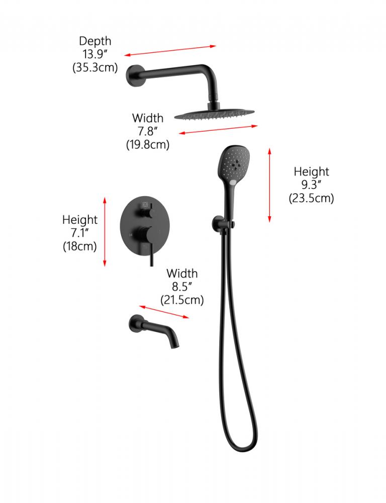 Experience the pinnacle of shower versatility with our shower set, featuring both a handheld showerhead and an adjustable swivel wall-mounted showerhead. Customize your shower experience based on your preference, thanks to the two-handle valve trim providing precise control over water temperature and flow. Seamlessly switch between the handheld and wall-mounted showerheads with our two-valve diverter, offering fingertip control. Tailor your water pressure with the handheld showerhead, allowing for gentle drizzles or powerful streams. Benefit from the flexibility of a 59-inch hose for expanded reach, facilitating convenient rinsing and cleaning. Effortlessly maintain the pristine look and performance of your shower set with rubber-like nozzles that make cleaning a breeze, ensuring freedom from mineral buildup. This package includes a rough-in valve, an 8-inch showerhead, a 14-inch shower arm, an Escutcheon flange, a 59-inch hose, a wall supply elbow, and a 7-inch faucet trim with handles, along with a 9-inch handheld showerhead and 8.5 inch tub spout. Enjoy the luxury and convenience offered by our comprehensive shower set.