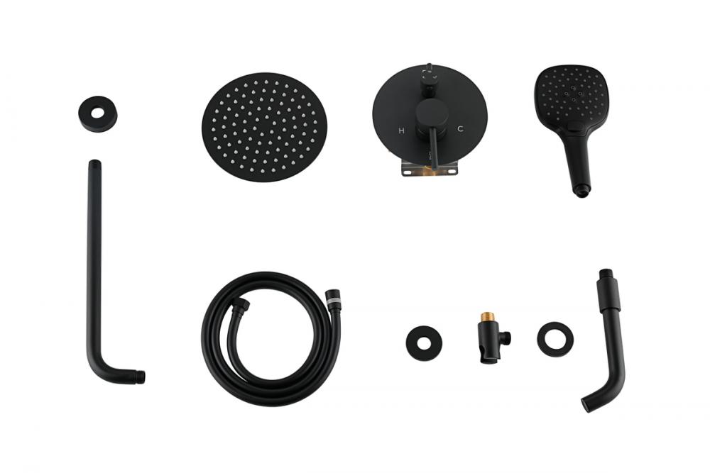 Package includes rough-in valve, 8-inch shower head, 14 inch shower arm, Escutcheon flange, 59 inch hose, wall supply elbow, 7 inch faucet trim with handles, 9 inch hand-held showerhead, 8.5 inch tub spout with flange.