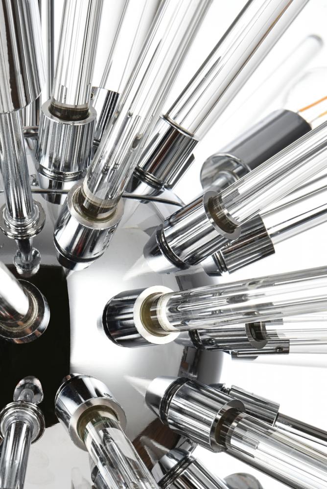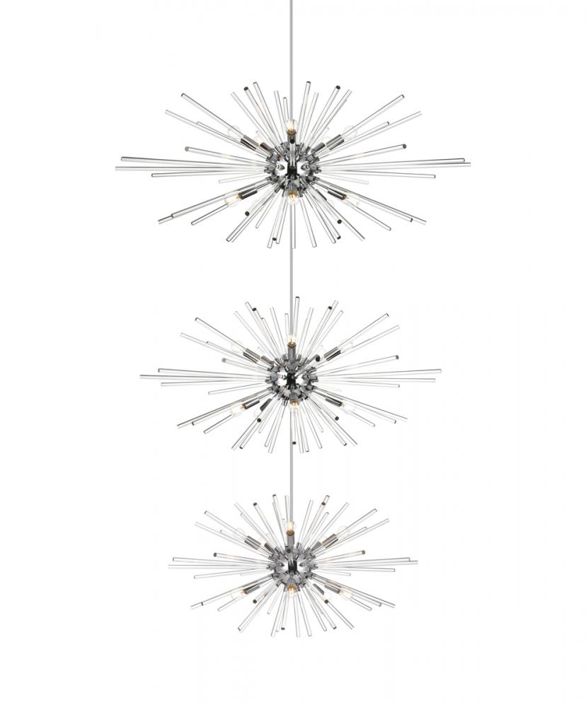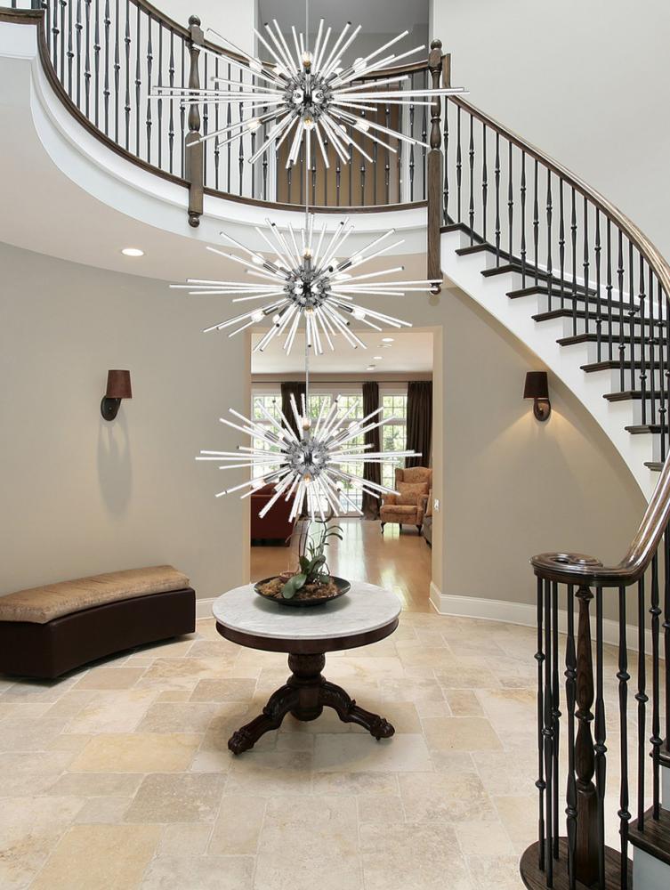 Features a captivating starburst design, creating a visually stunning centerpiece for your foyer. The arrangements of glass and metal elements in a radial pattern adds a touch of modern elegance and sophistication to any space.