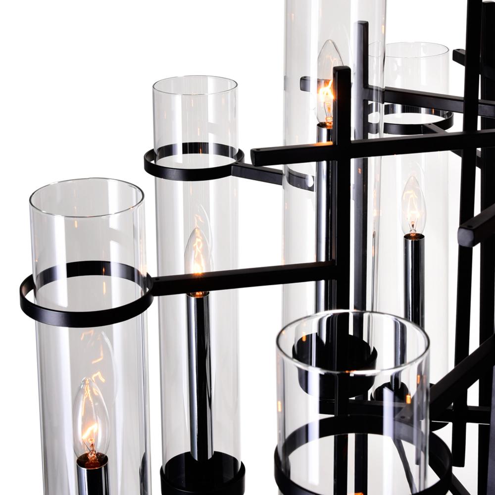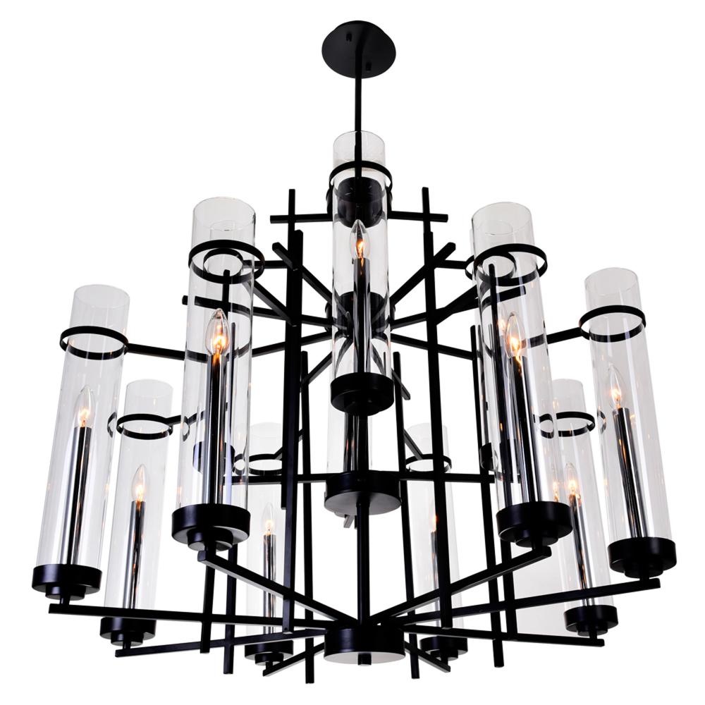 Designed with a dark metal frame balanced by clear cylindrical glass, the Sierra 12 Light Chandelier will bring a striking sculptural detail to your living room, dining room, or foyer. The dynamic silhouette of this oversized 38 inch up chandelier will sur