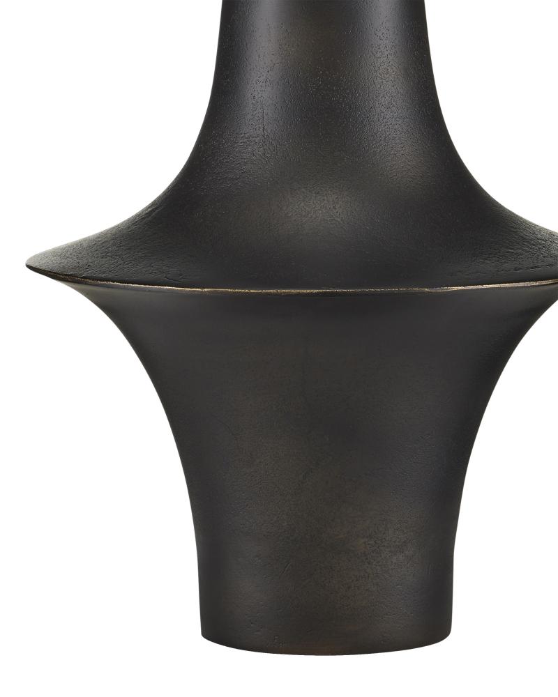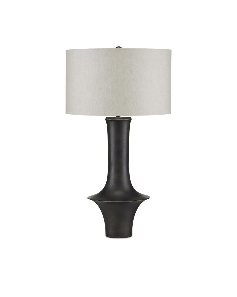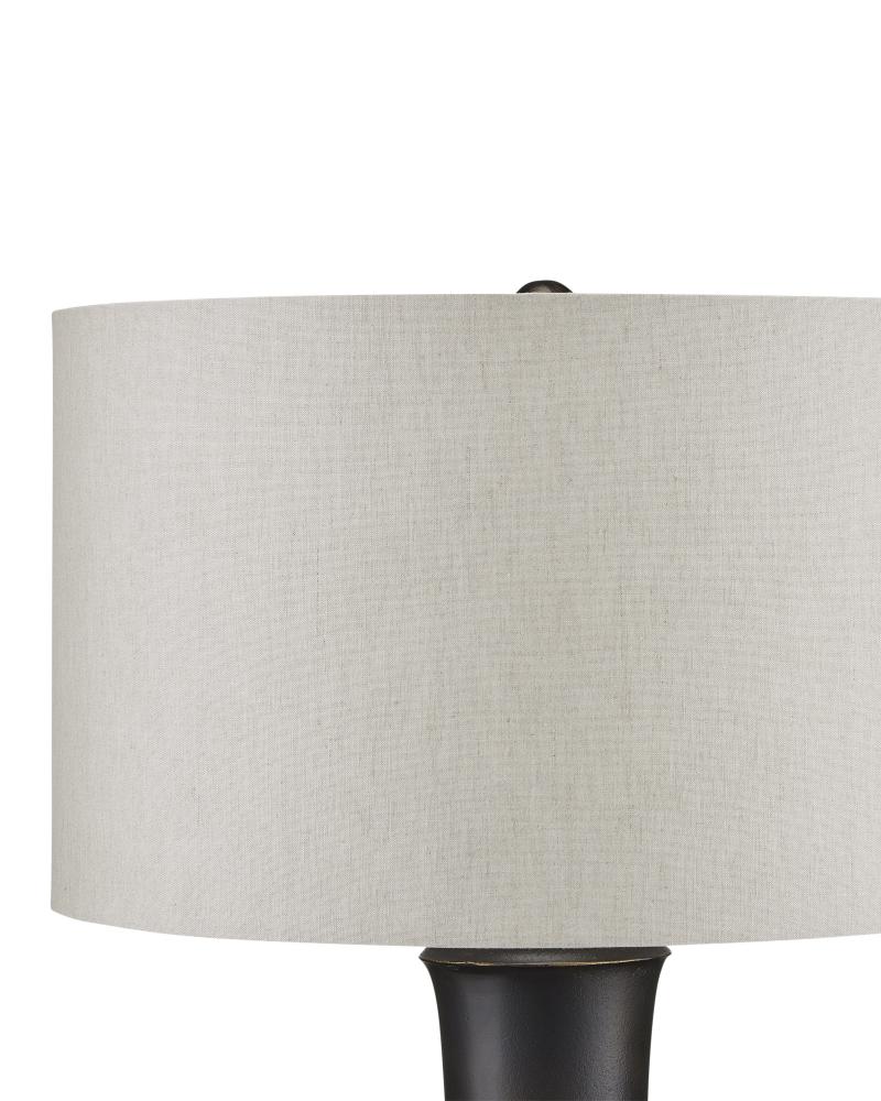 The Silvestri Black Table Lamp, with its flaring shape that straddles the mid-century modern and industrial design eras, is made of cast aluminum in a matte black finish. The surface has a subtle pitting that was achieved through a sandcast method. The natural linen shade brings the black table lamp even more texture and heightens the warmth of the overall composition.