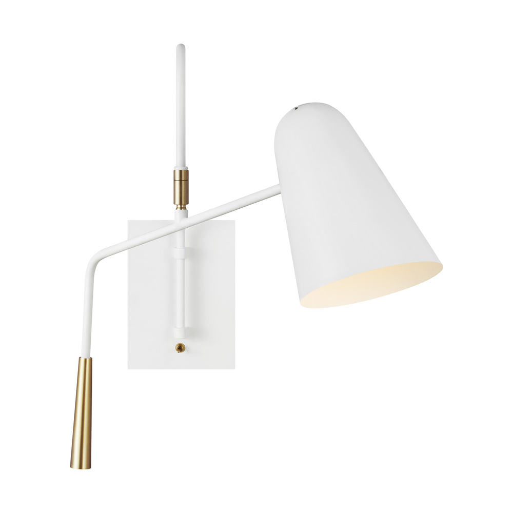 The Simon one light wall sconce in Matte White provides abundant light for your bath vanity, while adding a layer of today's style to your interior design. Simon is a task-oriented wall sconce, with swivel functionality to shine light where you need it. A luxe two-tone finish of Midnight Black with Burnished Brass accents gives a modern update to this vintage-inspired silhouette.