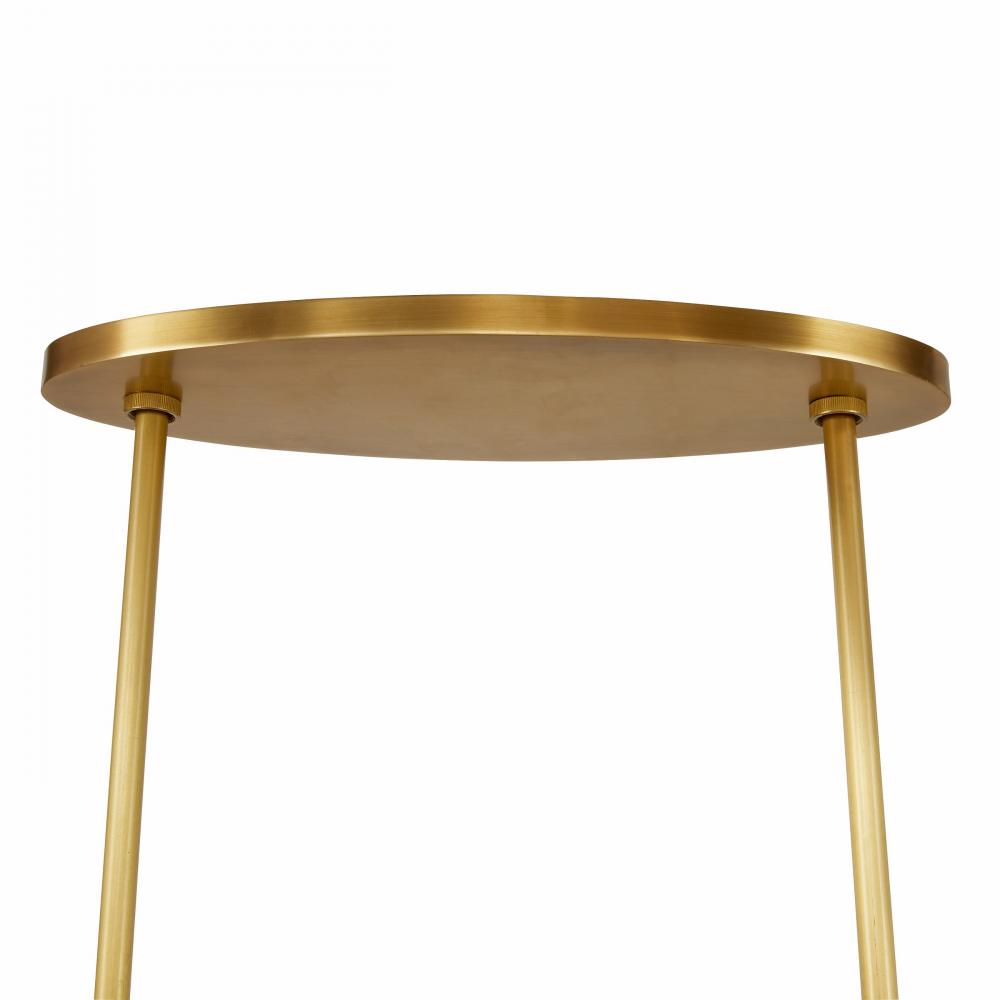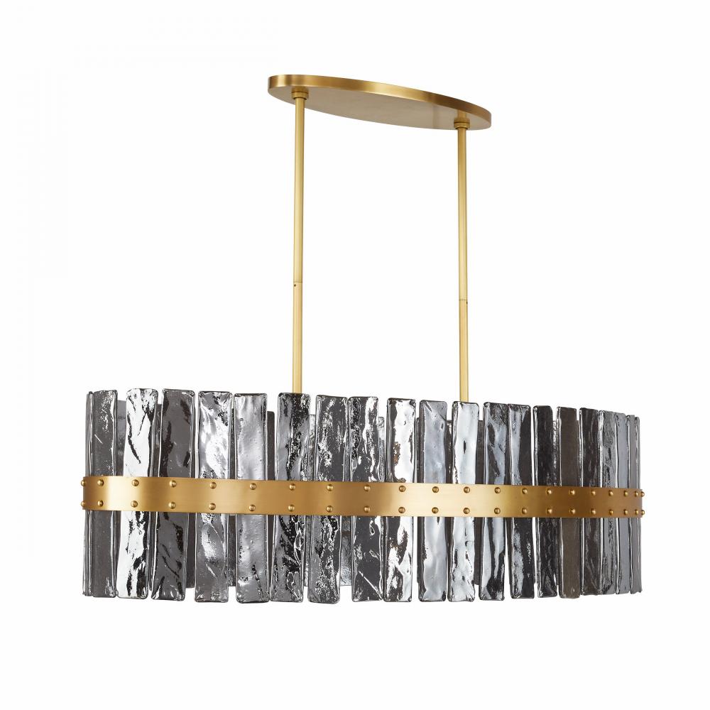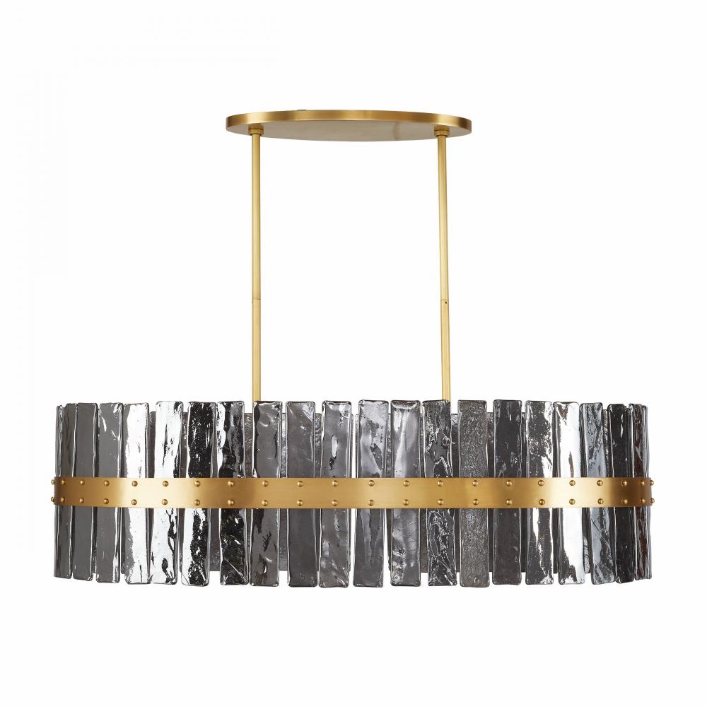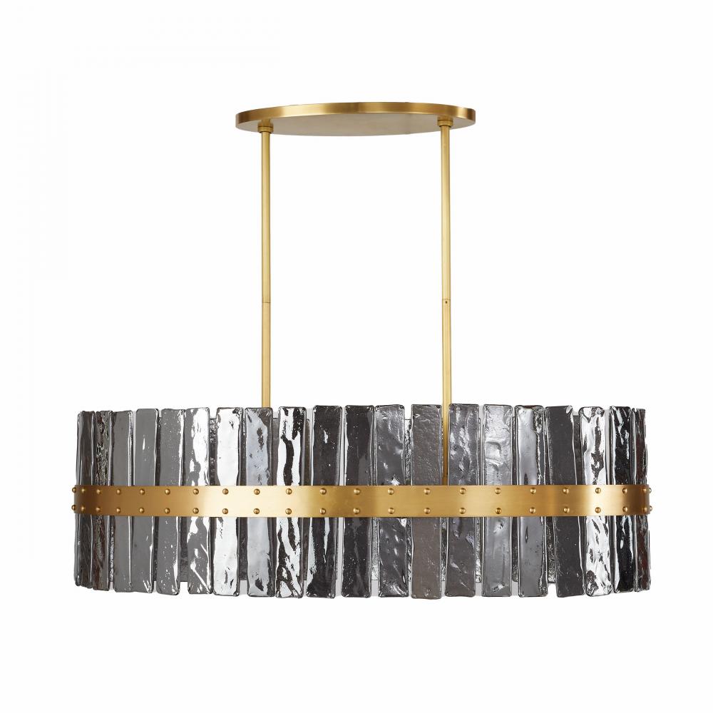 An update of one of our most timeless styles, the Sinclair is constructed of over 20 panels of smoke luster glass, each formed by hand to possess their own individual shapes and natural edges. An outer steel band plated in antique brass with rivet details offers an unexpected edge to its refined aesthetic. Finish will vary.