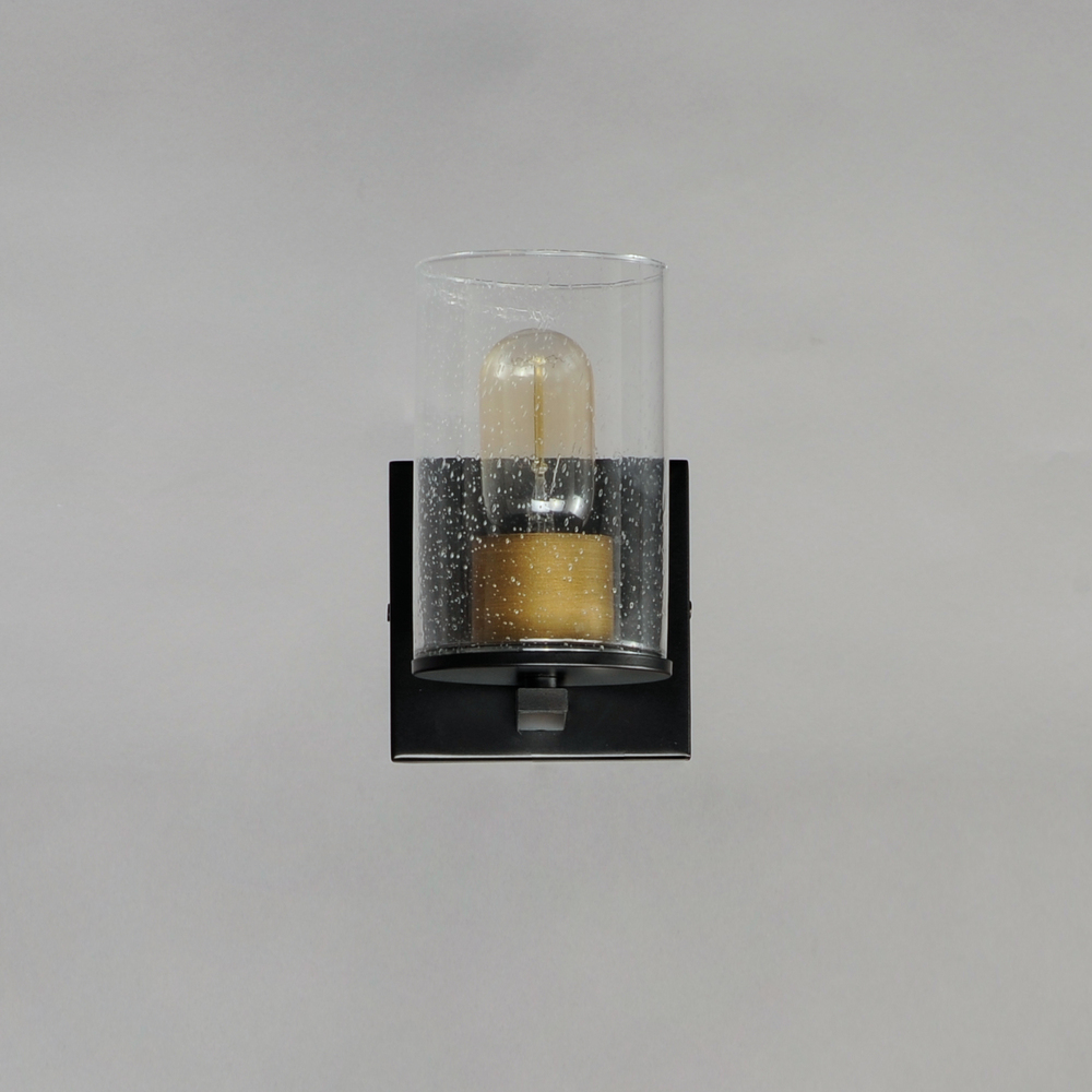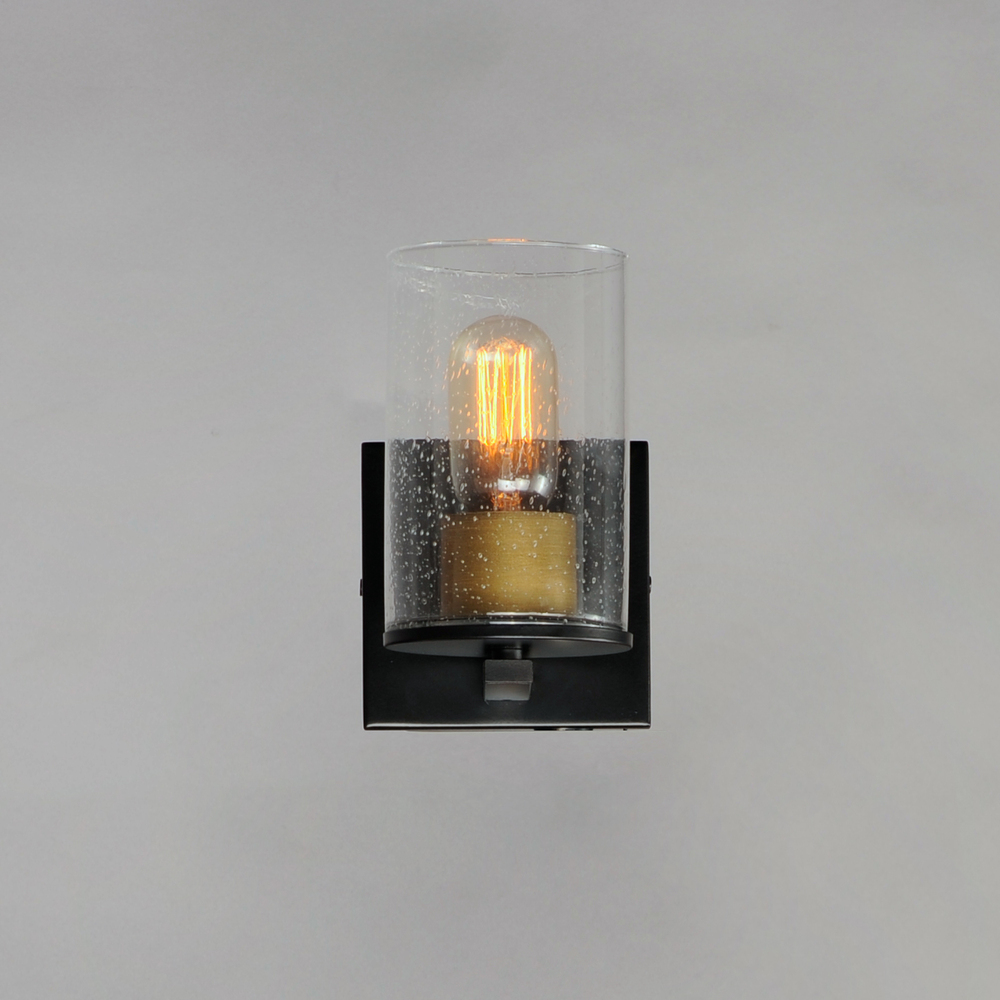 Cylinders in Clear Seeded glass on simple Satin Nickel frames or matte Black frames with Antiqued Brass socket covers. Pivoting arms on chandelier allow it to direct light up or down. Use filament lamps either tubular or Edison in shape for a Coastal or In