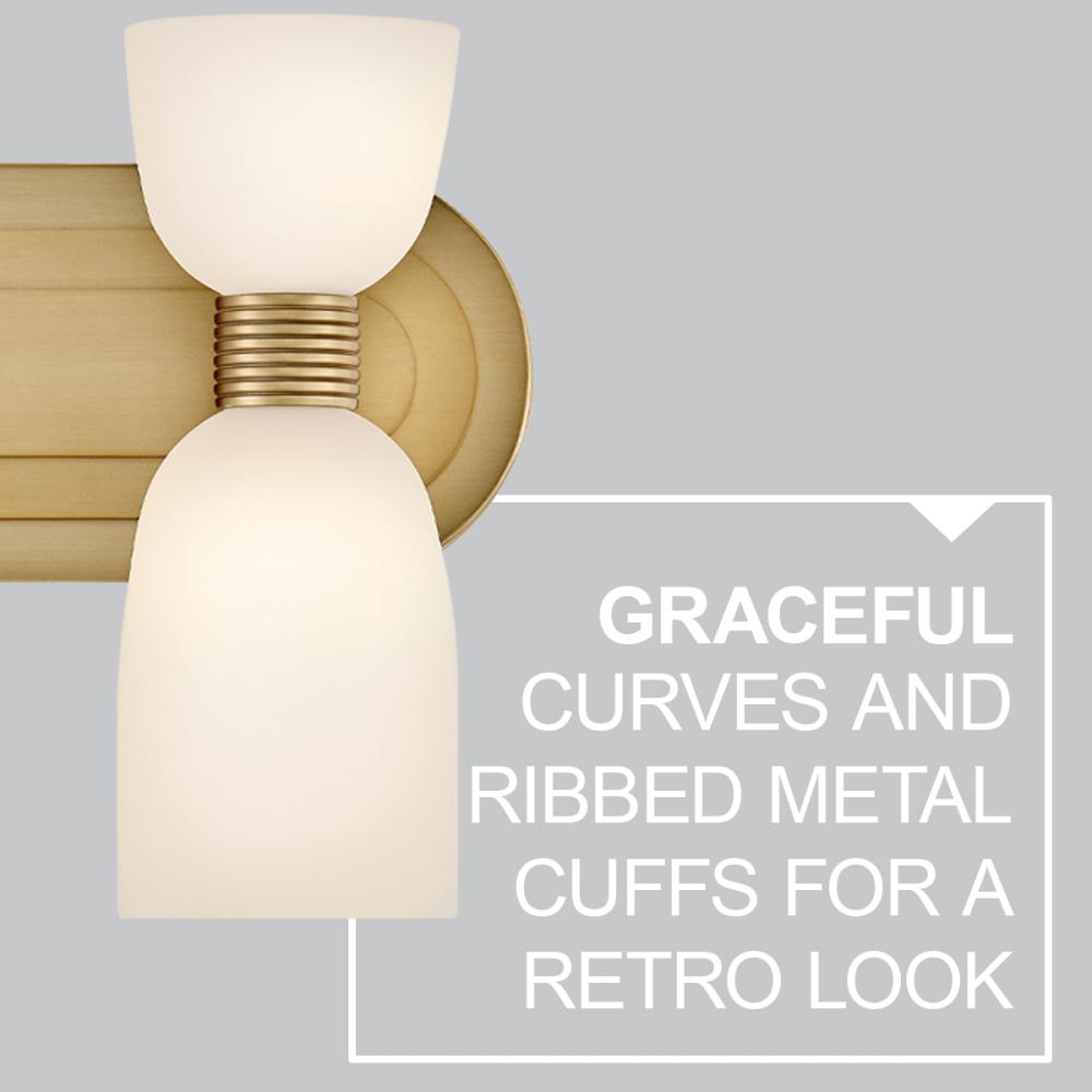 Graceful curves and delicate details define Tallulah. The smooth etched opal glass adds a touch of softness to balance the ribbed metal cuffs. The stepped oval backplate has a nuanced retro look that makes this vanity light the perfect addition to any bath décor. Tallulah is part of the Lisa McDennon Collection.