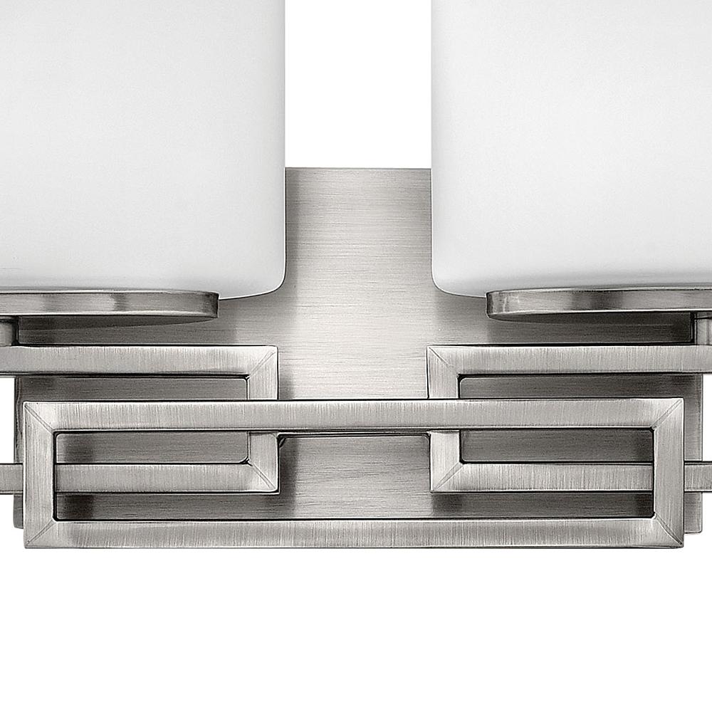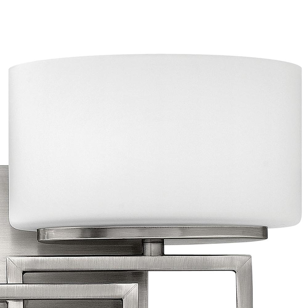 Lanza features contemporary styling with geometric patterns that are emphasized in Antique Nickel and Brushed Bronze finishes. The elongated oval, etched opal glass reinforces its sleek design.