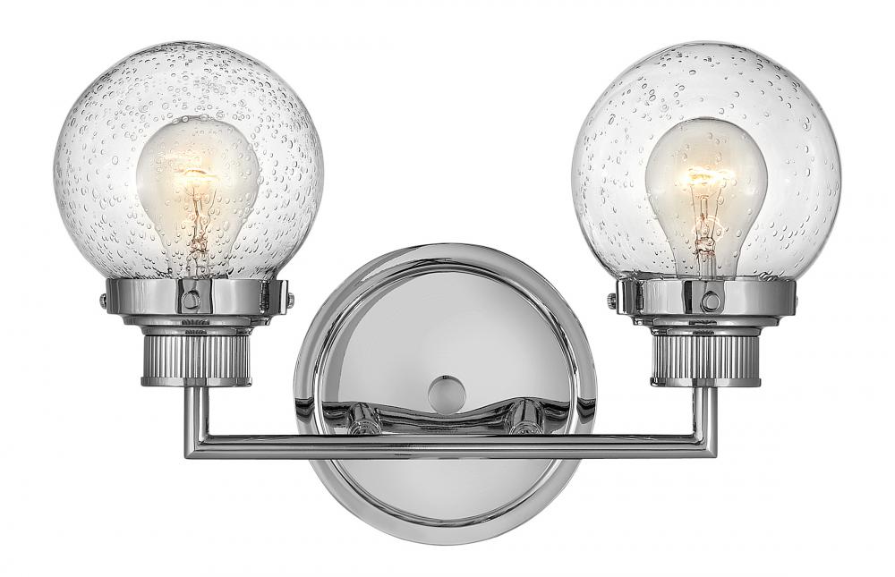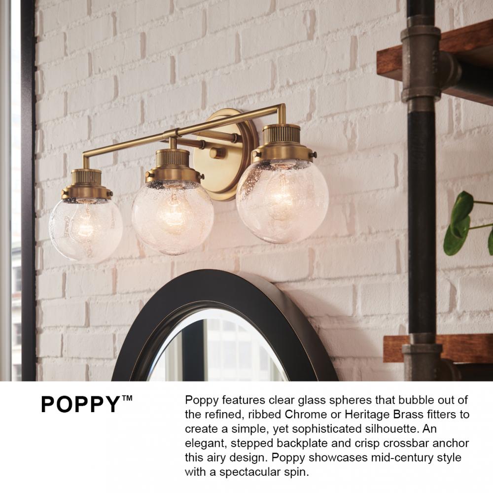 Poppy features clear glass spheres that bubble out of the refined, ribbed Chrome or Heritage Brass fitters to create a simple, yet sophisticated silhouette. An elegant, stepped backplate and crisp crossbar anchor this airy design. Poppy showcases mid-century style with a spectacular spin.