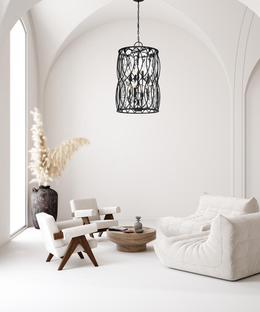 Get an unbelievably cool lighting look with the Savoy House Snowden 8-light pendant. Its tall, slim, cylindrical structure features an intricate curving design that perfectly accentuates the glacier glass shade within. Finished in Matte Black. Snowden is 30" in height and 18" in width. It uses eight candelabra size bulbs of up to 60 watts per bulb. Bulbs are not included.