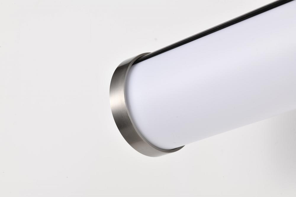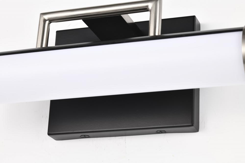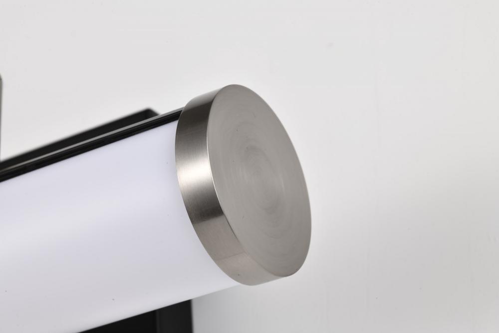 The design of the Solano 62-656 integrated LED small bathroom vanity light is sleek and minimalist, with a simple yet elegant shape. The stylish fixture is finished in black with brushed nickel accents that accentuate the clean lines and broad backplate. A