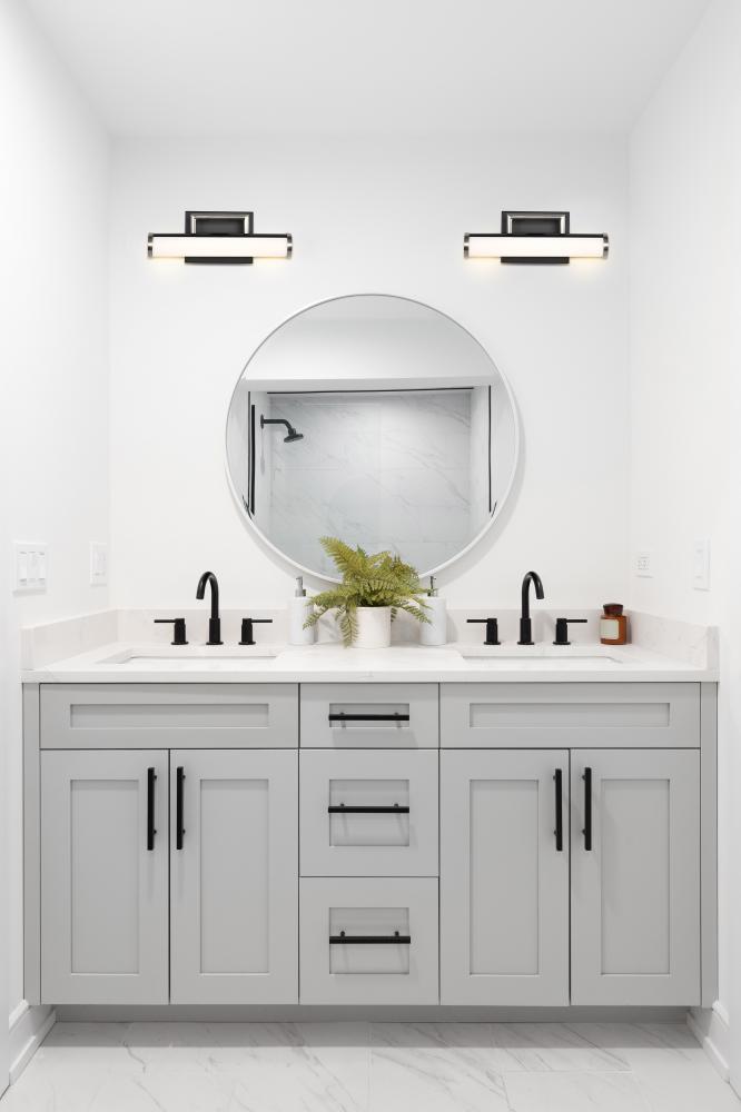 The design of the Solano integrated LED bathroom vanity lights series is sleek and minimalist, with a simple yet elegant shape. These stylish fixtures are available in black with brushed brass accents, or black with brushed nickel, to accentuate the clean