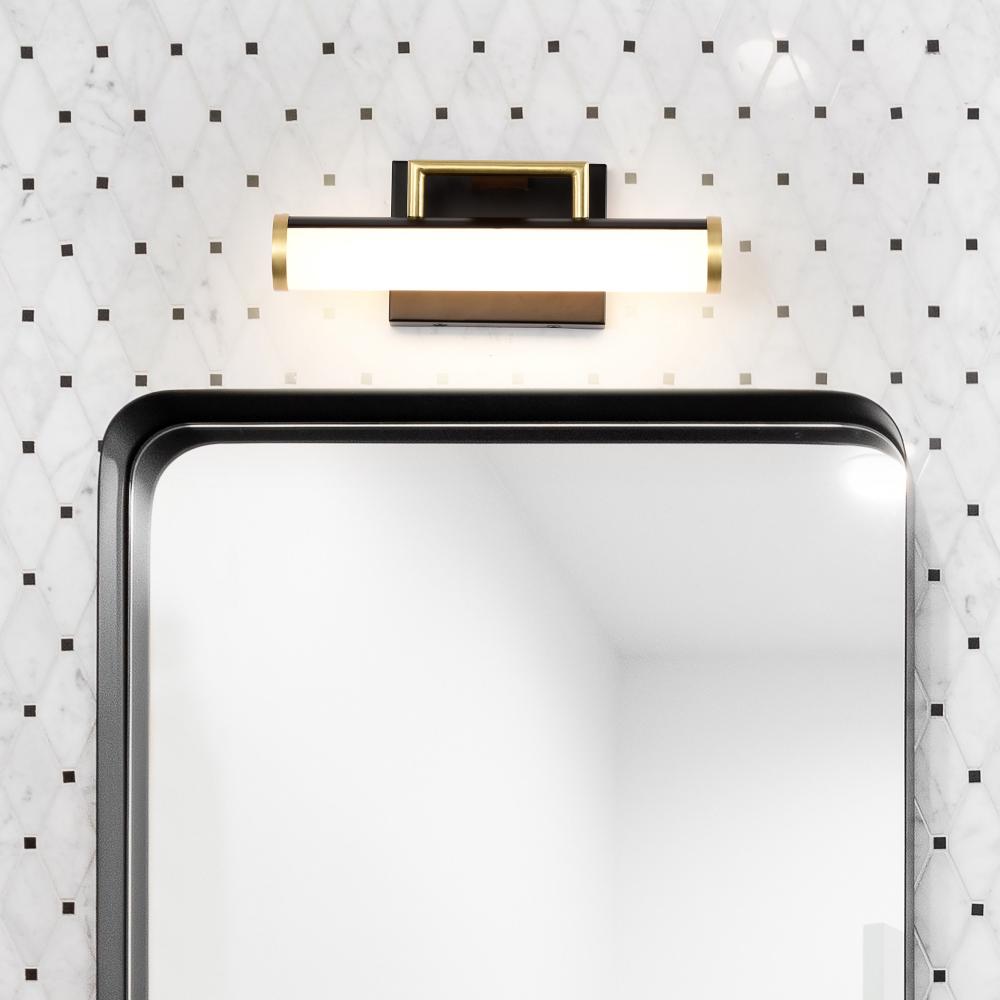 The design of the Solano integrated LED bathroom vanity lights series is sleek and minimalist, with a simple yet elegant shape. These stylish fixtures are finished in black with brushed brass accents accentuate the clean lines and broad backplate. A white