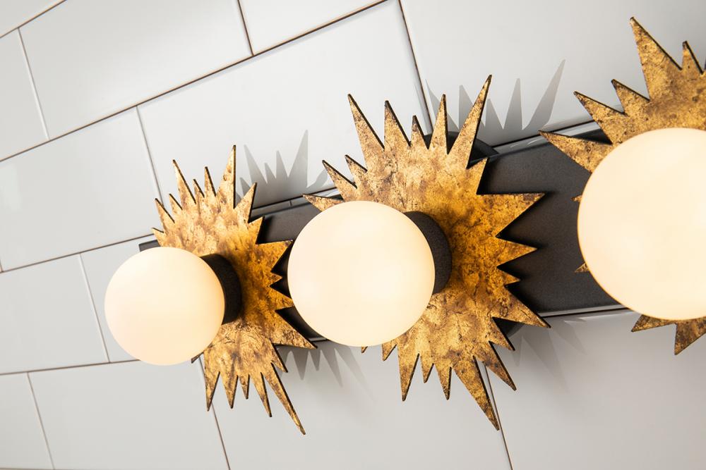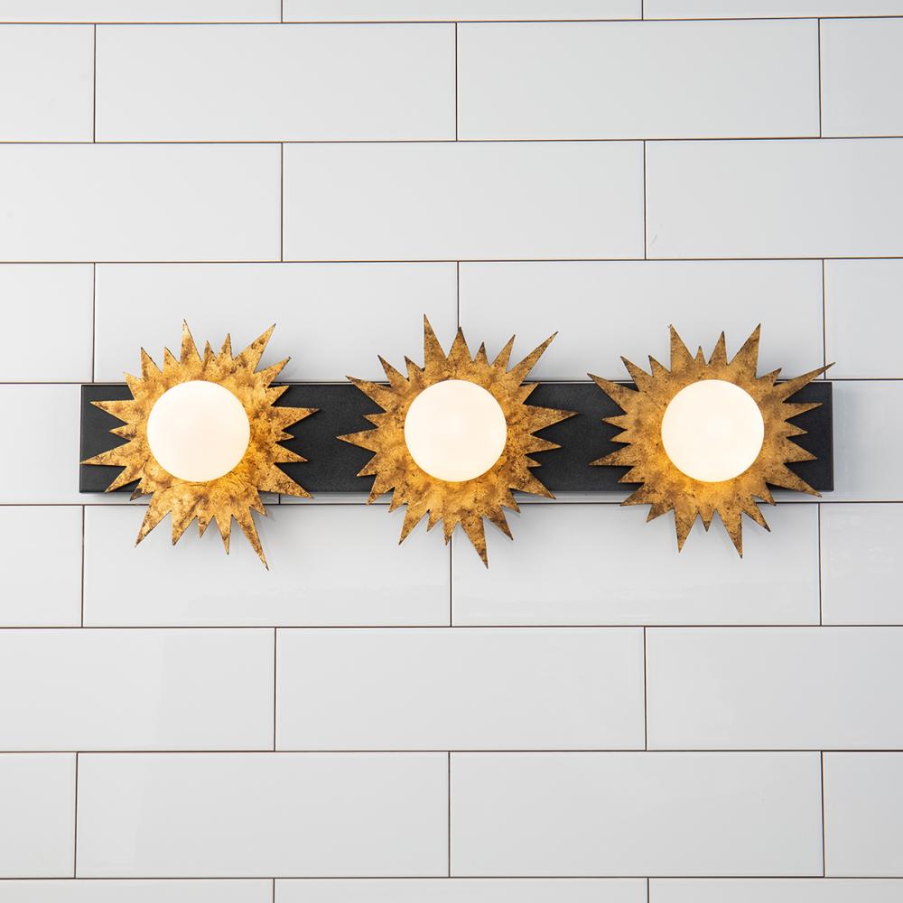A 24" x 8.5" x 4.5" sun-shaped 3-light vanity in mixed metals. Perfect over mirrors, it adds whimsical texture and drama to sophisticated bathroom spaces.