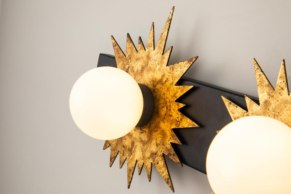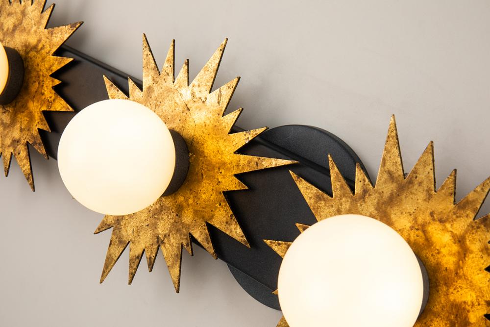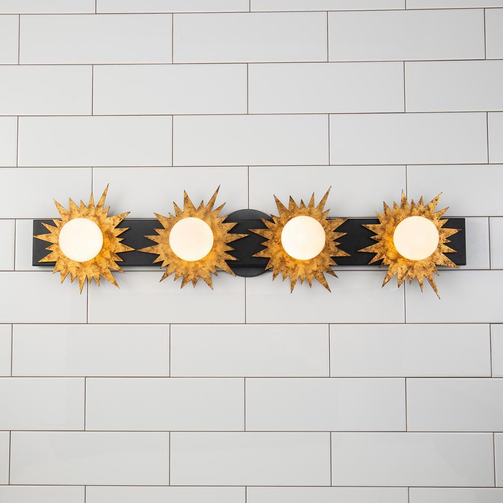 A 32" x 8.5" x 4.5" sun-shaped 4-light bath bar in mixed metals. Ideal over double sinks or mirrors, it brings whimsical texture and drama to bathrooms.