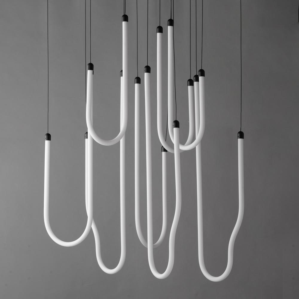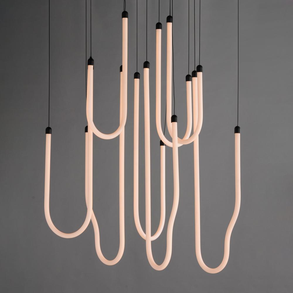 Sweeping matte white acrylic tubes encase an omnidirectional LED light source, arranged in abstract configurations inspired by solar flares. Minimal in composition yet dramatic in form, the Soleil collection offers a striking lighting solution. Available i