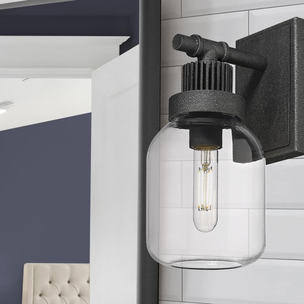 Truly a restoration design, the Somers Collection features stylized iron pipe fittings on the frame and sturdy gear shaped glass holders. The jar inspired glass shades are ideally paired with either the textured black and weathered iron finish.