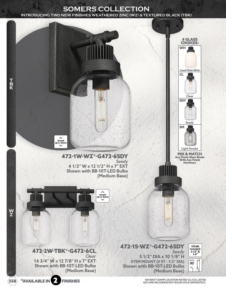 Truly a restoration design, the Somers Collection features stylized iron pipe fittings on the frame and sturdy gear shaped glass holders. The jar inspired glass shades are ideally paired with either the textured black and weathered iron finish.