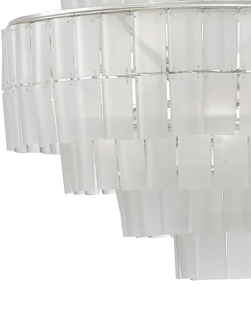 Each layer of the Sommelier Blanc Chandelier is made of individually-cut pieces of frosted glass sourced from recycled bottles. Each piece is textured and unique in its own way to enhance the frame's bright contemporary silver leaf finish. Due to the nature of recycling and the variations in tones, each of these eight-light fixtures is one of a kind. We also offer a version of the Sommelier with green glass. If you prefer a cascading shape, take a look at our Vintner chandelier the same glass.