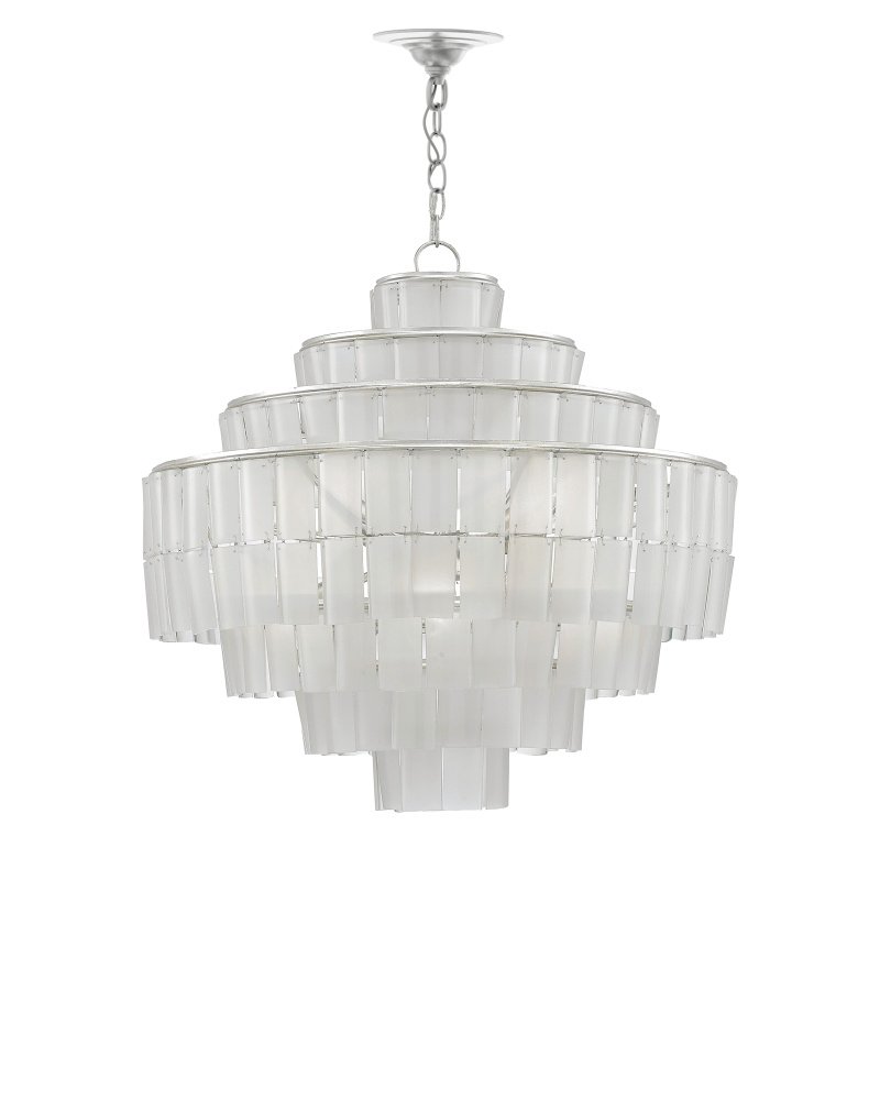 The distinctive white hues of the recycled glass used to make the Sommelier Blanc Chandelier bring this fixture its feeling of luminosity. Natural uneven textures on the hanging glass pieces affixed to the white chandelier are accentuated by a contemporary silver leaf finish. Adjustable from 31" to 100" with use of included chain/rod kit/cable. If your space calls for a longer drop, additional chain/rods/cable is available for purchase.