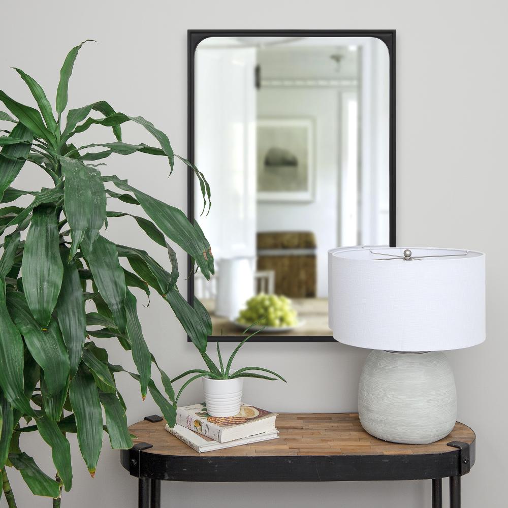 The sophisticated styling of this traditional wall mirror reveals a raw, yet refined charm. The carved wood mirror frame clips the rectangular looking glass into neatly curved corners, gently rounding at the inner edges. A black powder coated finish adds a hint of industrial chic to the decorative mirror’s farmhouse influences.
