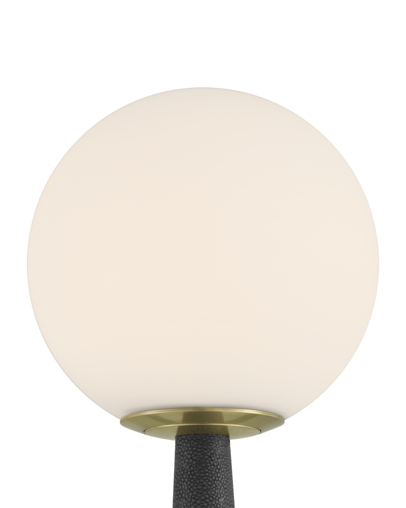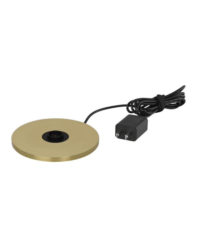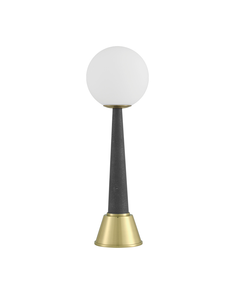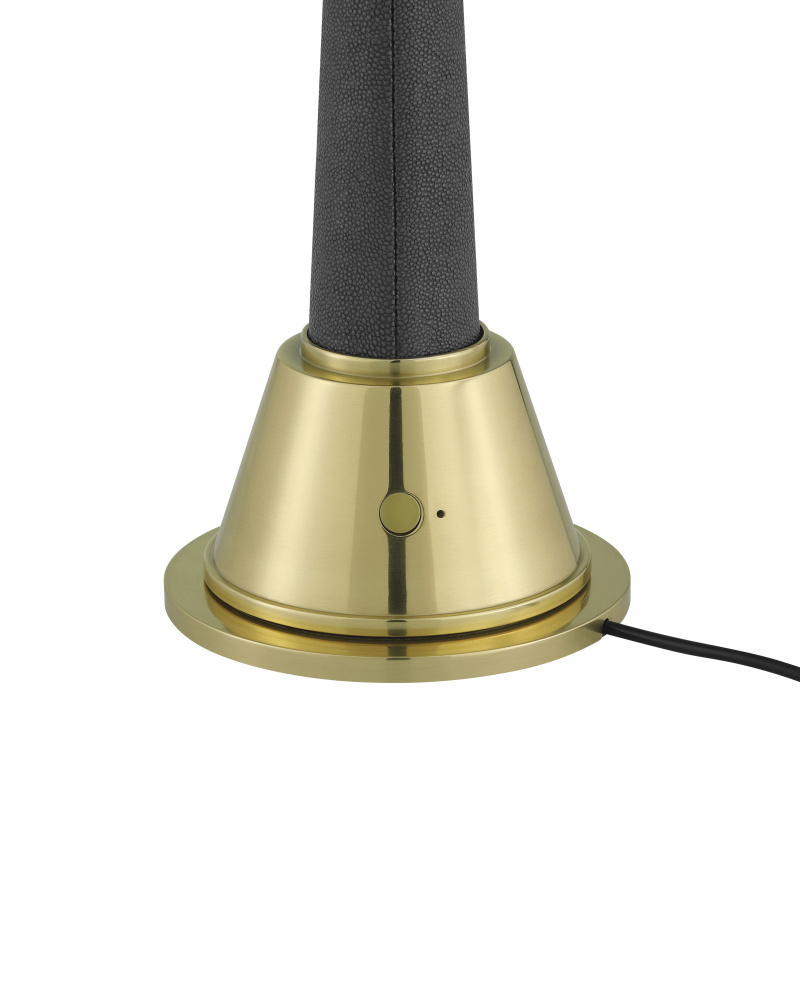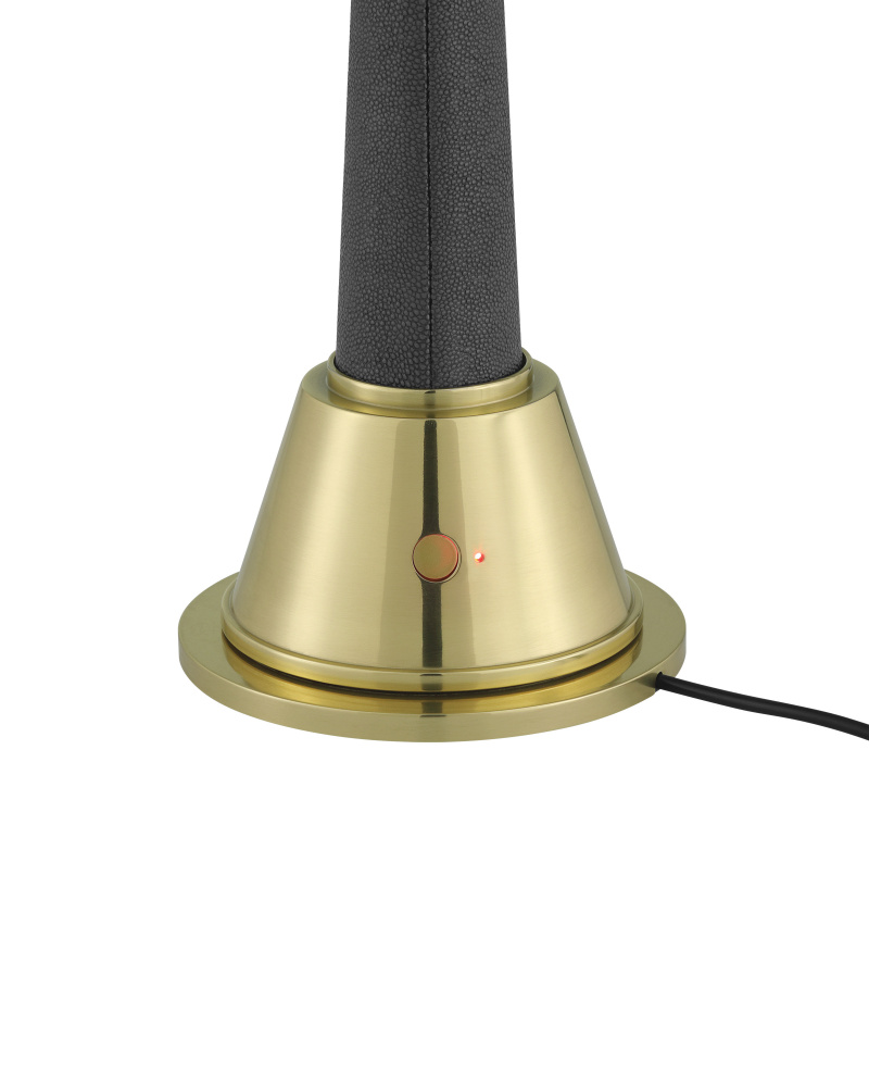The Sortie Brass Cordless Table Lamp is a gold lamp that is always ready for action. The metal base in a brass finish holds the on/off switch. The telescoping body of the petite lamp is covered in a dark gray faux shagreen, and a frosted glass globe sits atop the lamp. to recharge, simply place the Sortie on a separate charging pad.