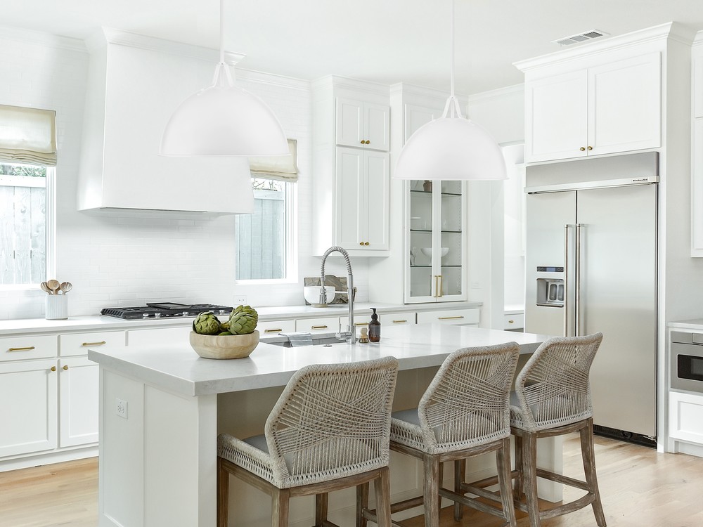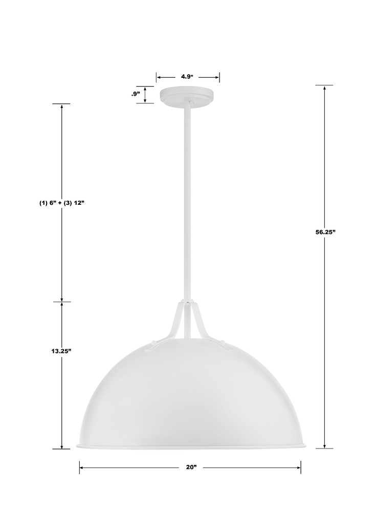 A large dome metal shade presents a clean and streamlined silhouette for our Soto collection. This sculptural one-light or three-light pendant is available in Matte Black with contrasting Antique Gold or Matte White. This industrial meets modern farmhouse design shines direct light downwards into your space, making it a perfect choice when hung over a breakfast nook or in pairs over a kitchen island.