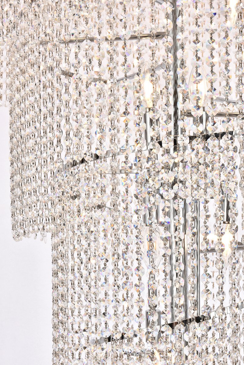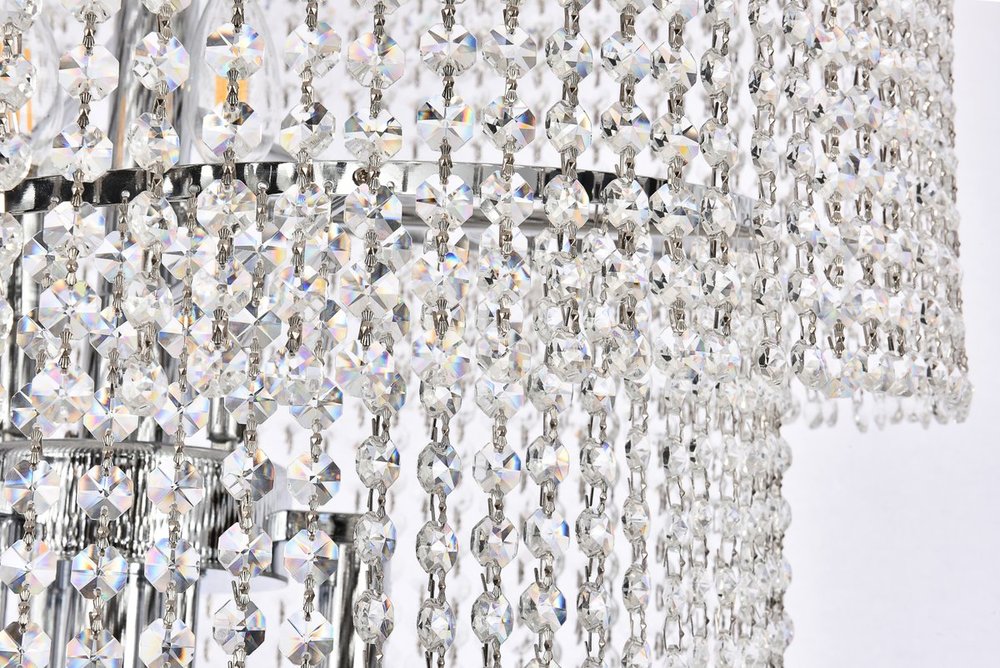 Strands of clear royal-cut crystals fall from the top ring with trailing strands cascading down the chrome frame