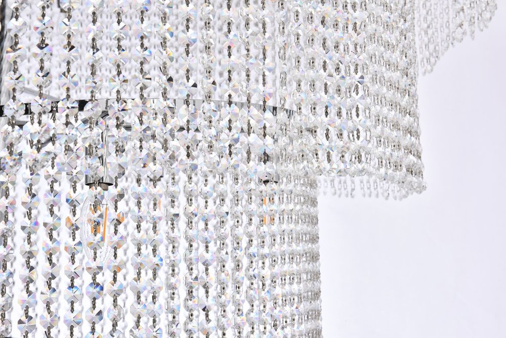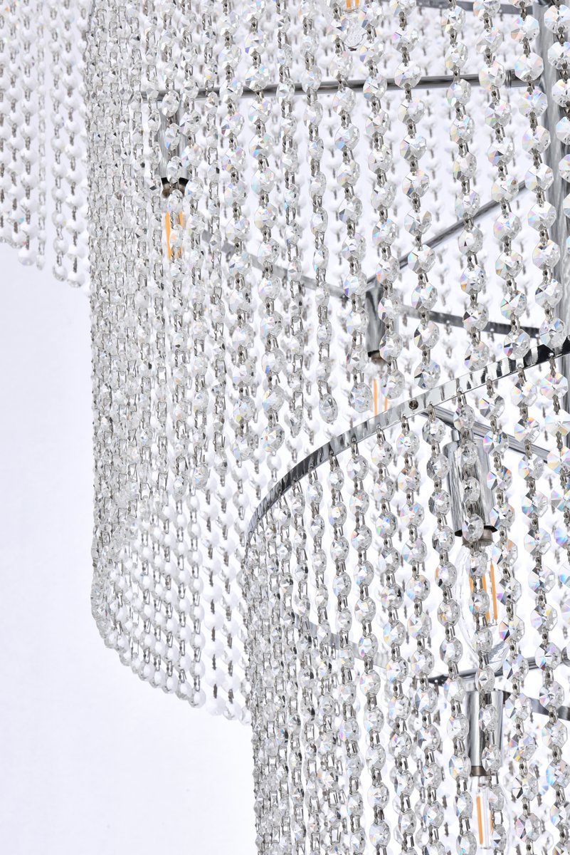 Strands of clear royal-cut crystals fall from the top ring with trailing strands cascading down the chrome frame