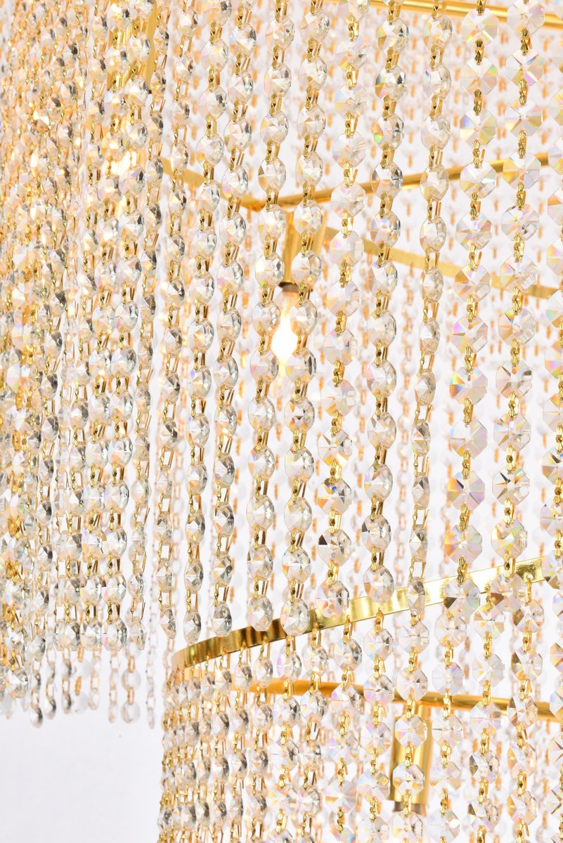 Strands of clear royal-cut crystals fall from the top ring with trailing strands cascading down the gold frame