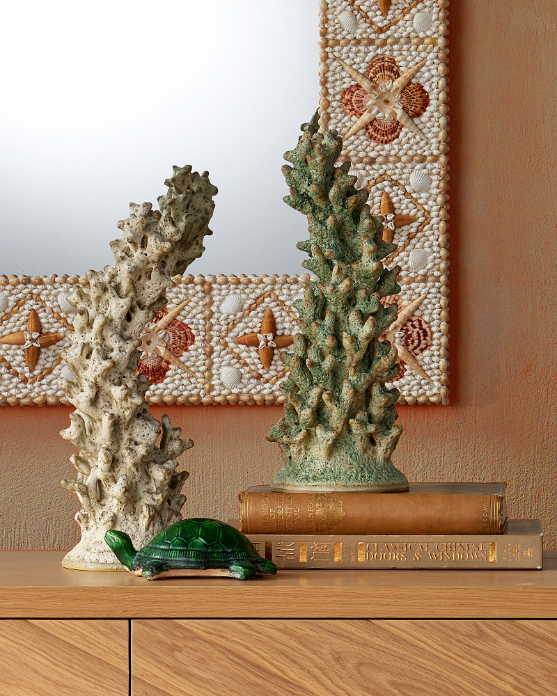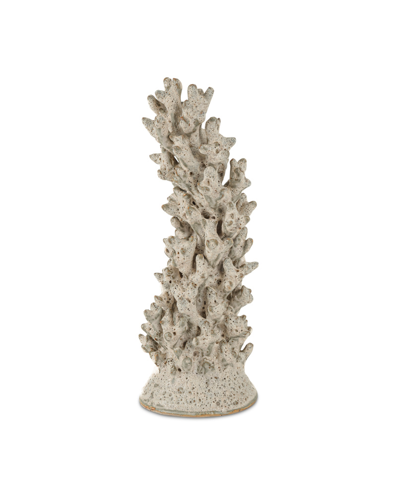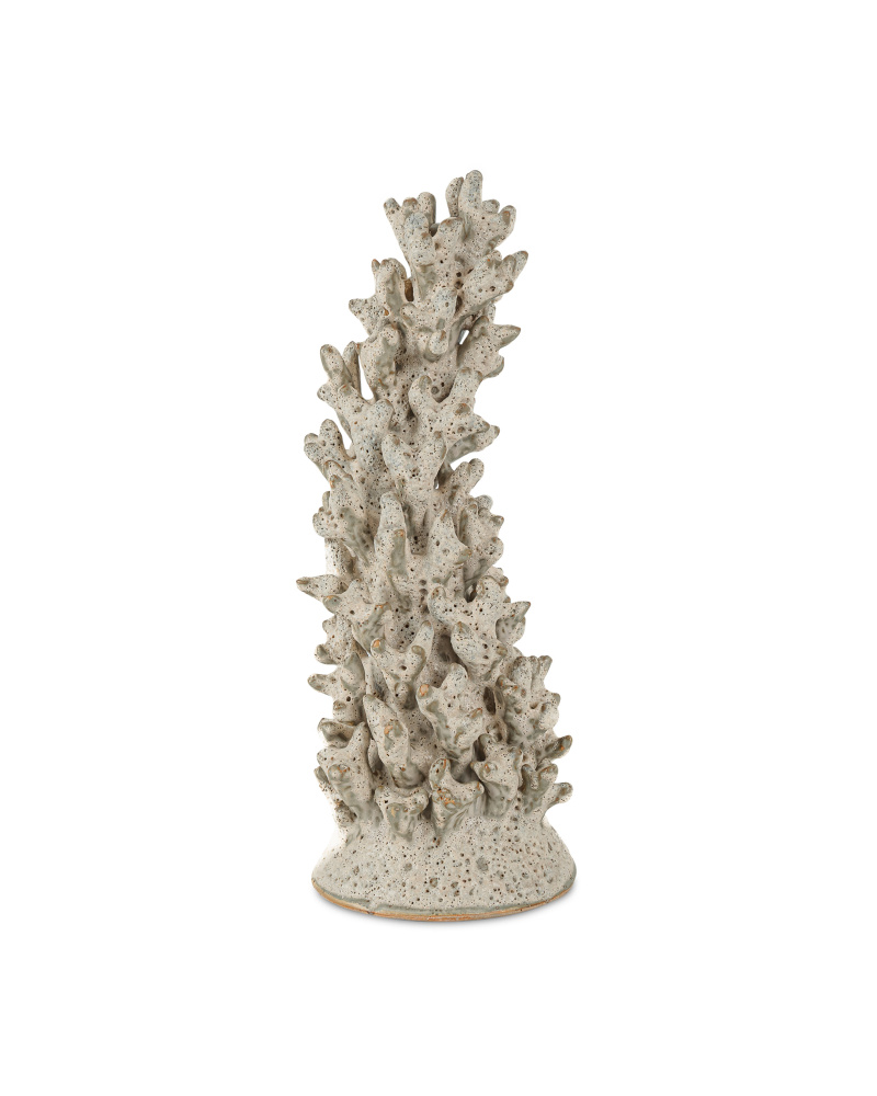 The Staghorn White Coral Object is a sculpture that resembles stacked horns of coral that look as if they have been plucked from the ocean floor. The dark clay ceramic piece was thrown and carved before being covered in a sunken white moss glaze that adds even greater texture with its abundance of pitting on its surface. The depth and dimension of these artful treatments make it feel naturally aged. The grayish-white decorative accessory stands 17 inches tall.