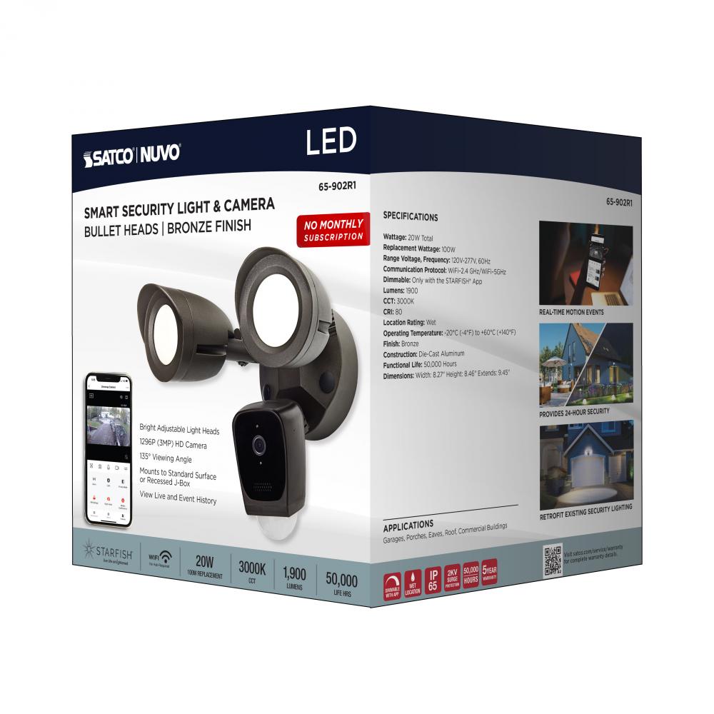 Stay connected and feel protected with SATCO’s 65-902R1 LED security floodlight with STARFISH technology. Featuring a 1296p HD camera with a 135-degree viewing angle, two-way talk, infrared night detection and advanced motion detection settings, you can