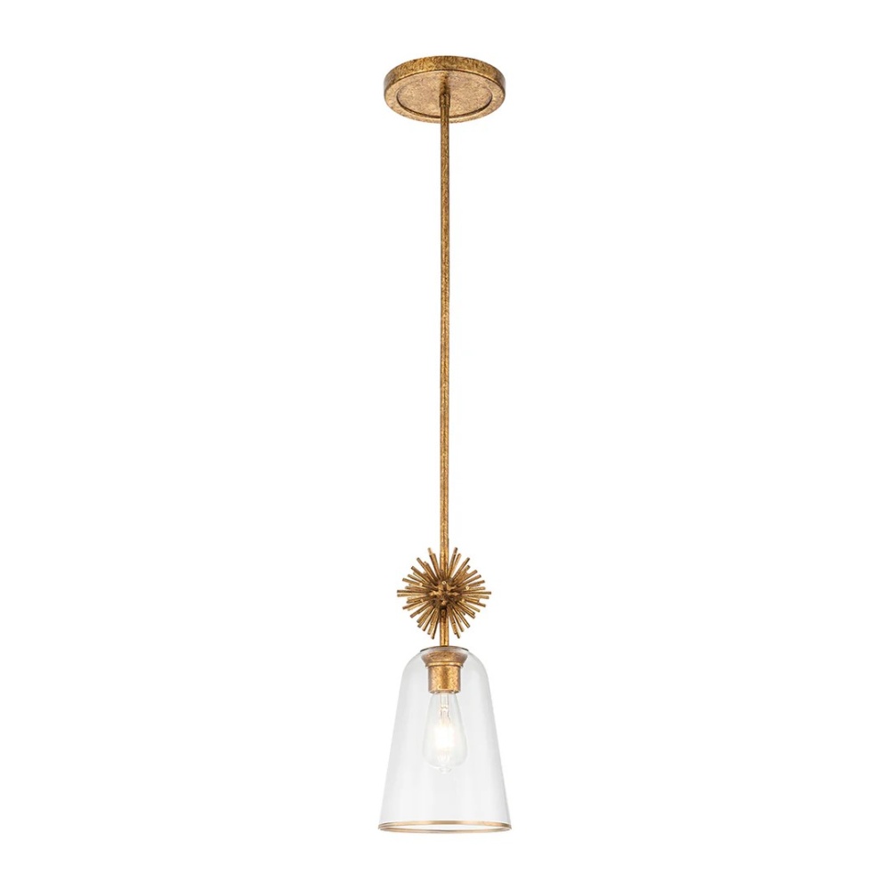 The Staring 1 Light Mini Pendant is 10" wide and finished in antiqued gold leaf. It offers adjustable height options when mounted. The glass is clear with a gold stencil around the bottom rim.