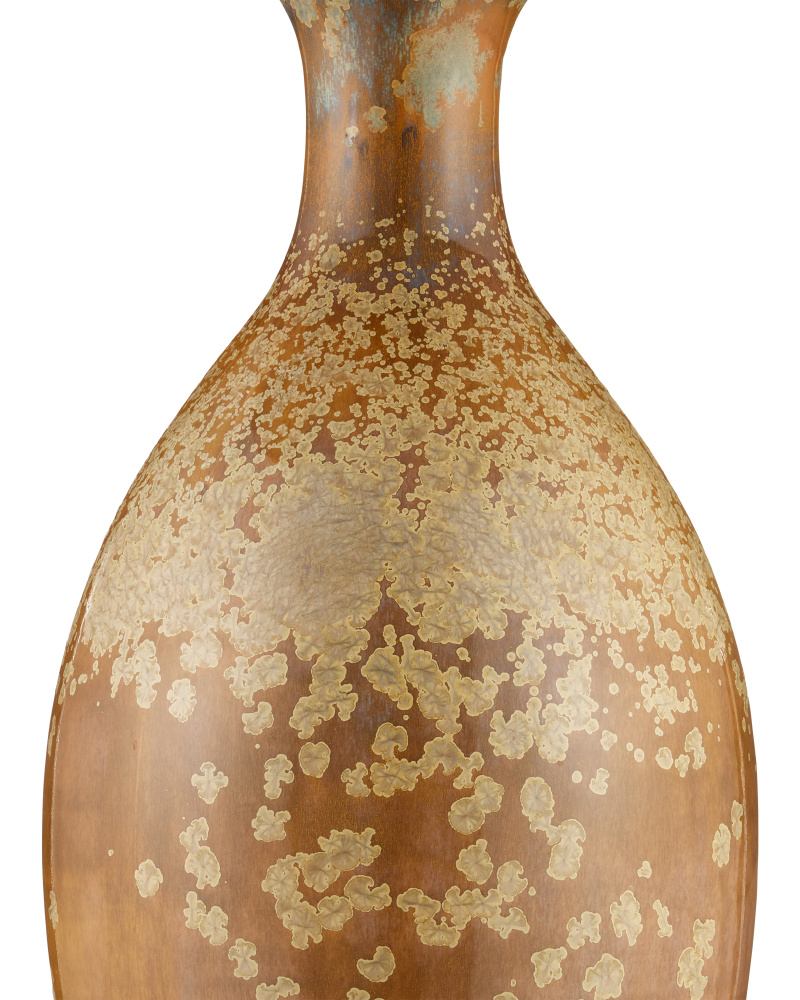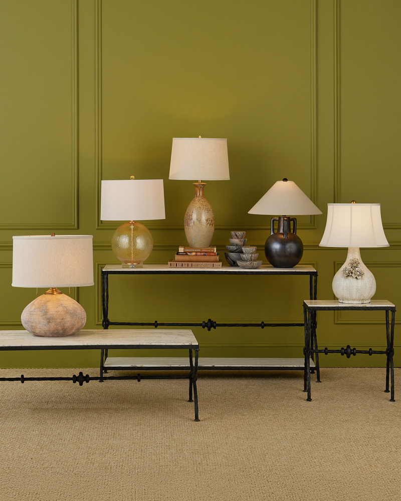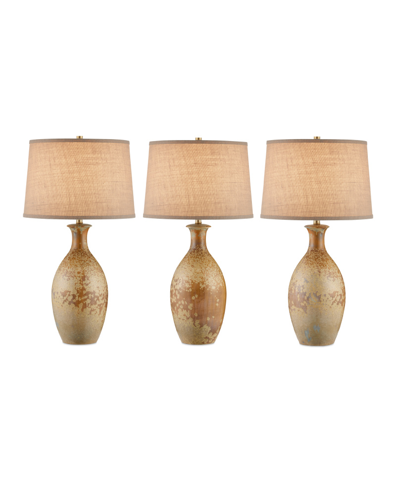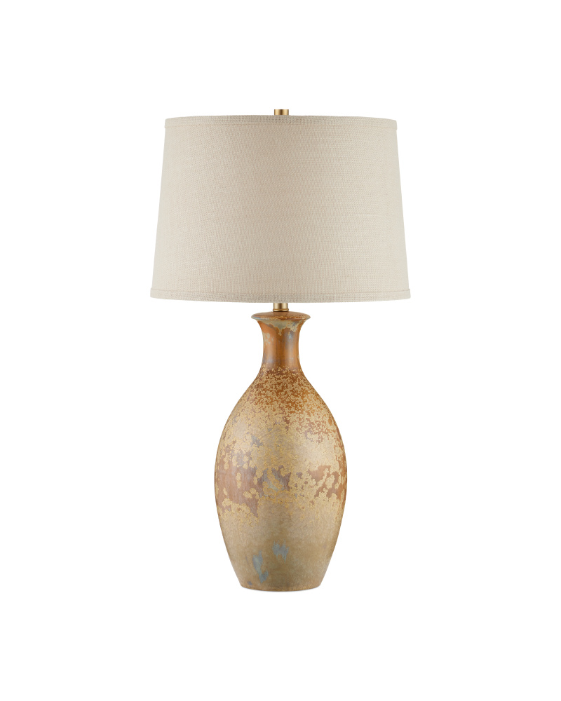 The speckled effect on the Stellata Table Lamp is known as crystallization, which occurs when multiple layers of glaze, each of a different color, are applied. When they blend together during the firing process, minerals in the glazes react to the high temperatures in the kiln and form tiny crystals on the surface. These add texture and sparkle to the glaze, enhancing its visual interest. No two of these lamps, which are fitted with burlap shades with a self-trim, will look alike.