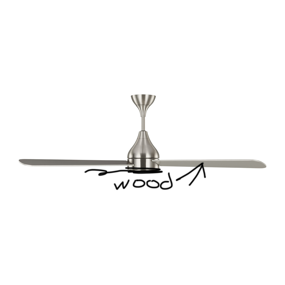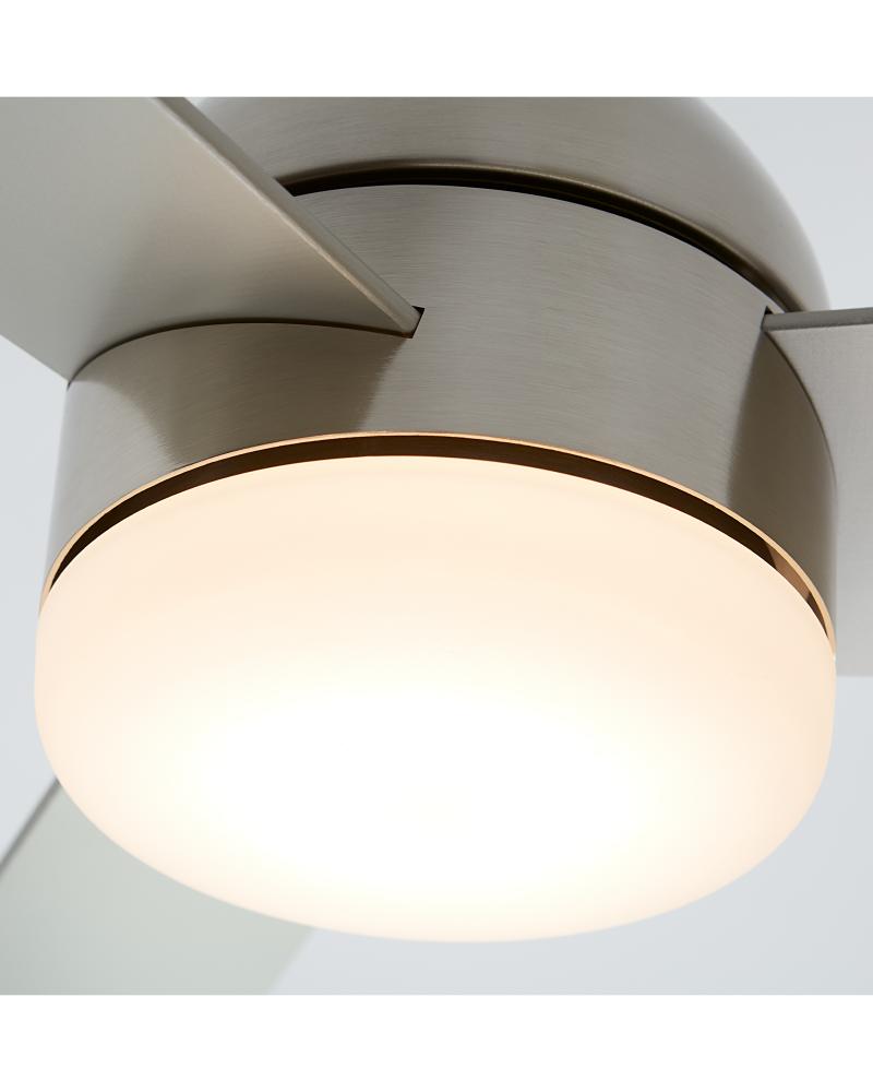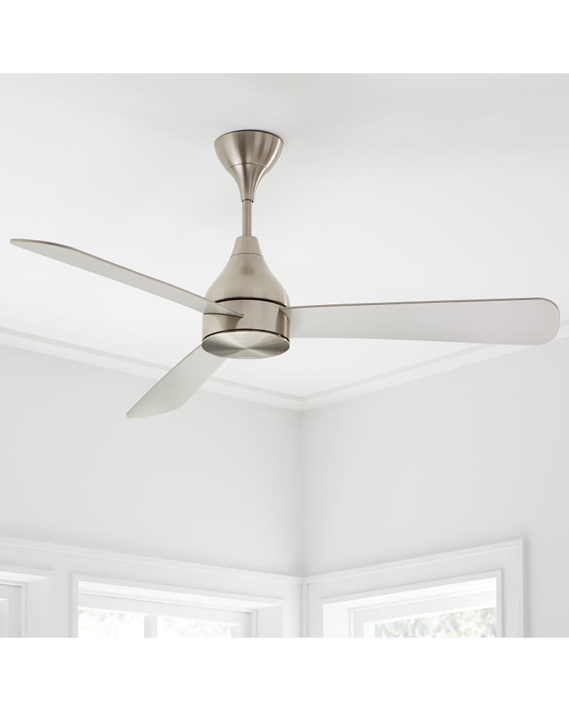 Energy-efficient DC motor fan with 8" brushed steel downrod included, sloped ceiling compatible, brushed steel blanking plate included for light kit removal