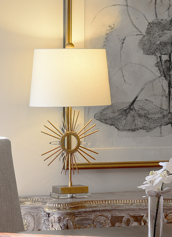 The Sun King Table Lamp showcases a striking sunburst design with elegant finishes and crystal accents. Standing 30" tall, it adds a Charming Modern Traditional flair. Perfect as a buffet lamp or in pairs for an inviting entryway statement piece.