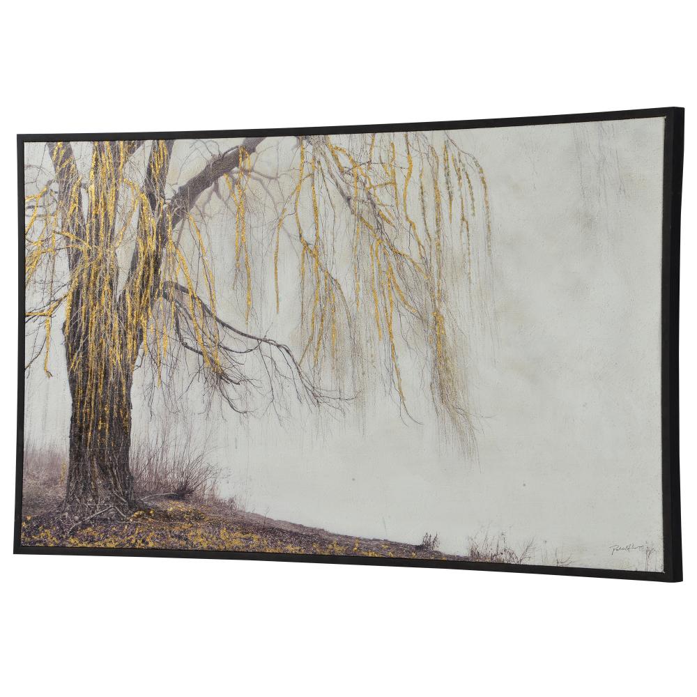 The hazy bayou landscape of this traditional canvas art piece infuses interior walls with a mysterious point of view. Burnished gold leaf accents add an air of autumnal beauty over the black and white print of a weeping willow tree, as barren branches and a rolling white mist make way for winter. A charcoal gray frame complements the natural beauty of the woodland painting, bringing a metallic touch to walls with homespun style.