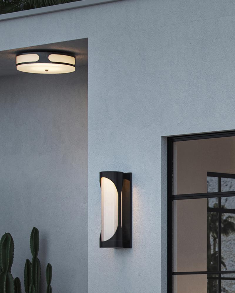 The Swale Outdoor Flush Mount has a graphic silhouette with cut outs where illumination can escape. The sides of the black flush mount are covered with a milky white glass that illuminates uniformly when the integrated LEDs shine through it. The metal is powdercoated to make this outdoor flush mount weather-worthy.